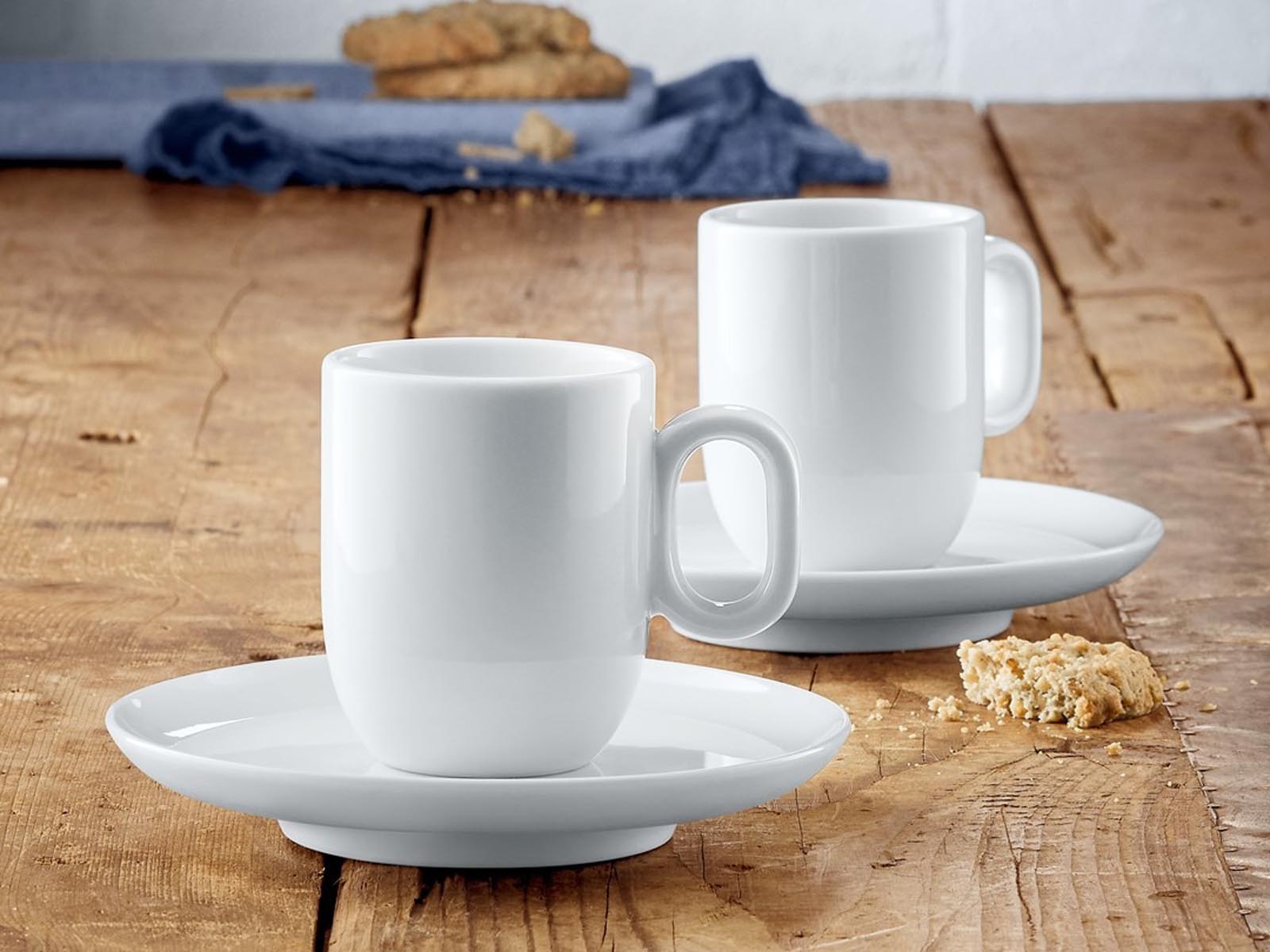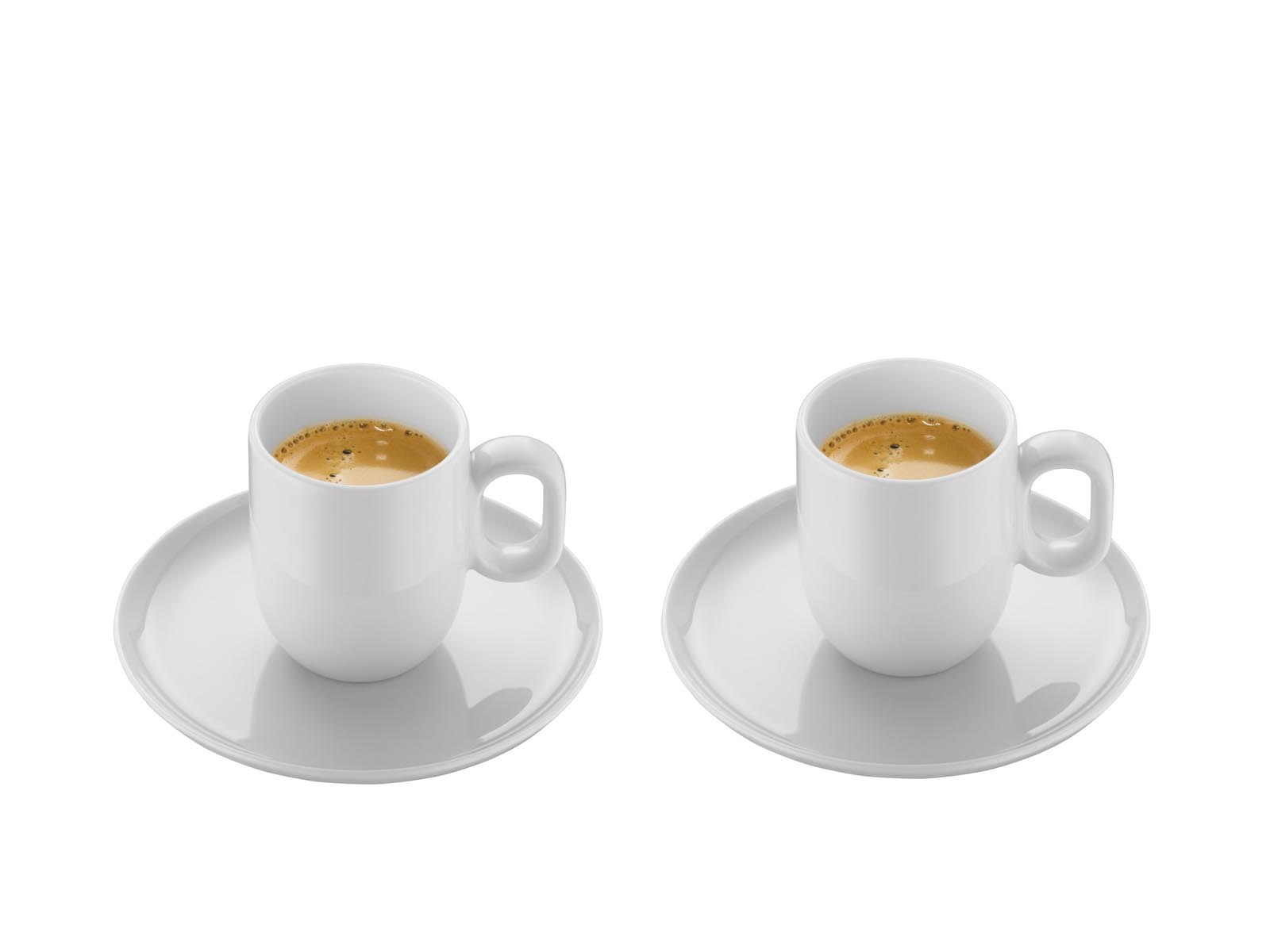 Filiżanki oraz podstawki wykonane są z wysokiej jakości białej gładkiej porcelany i zoptymalizowane pod względem kształtu, objętości, a nawet grubości materiału pozwalając w pełni wydobyć aromat i smak naparu kawy.