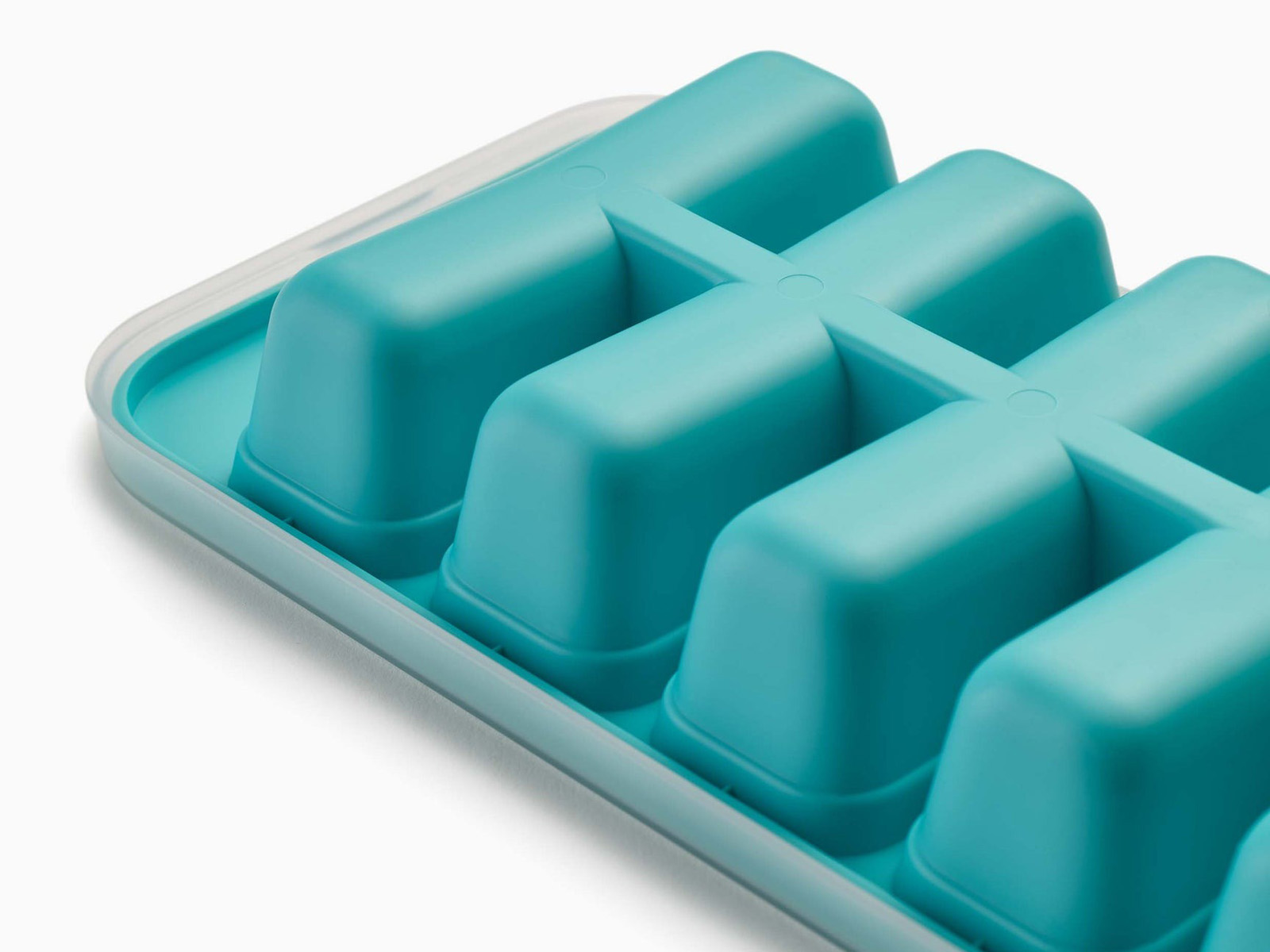 Pojemniki prostokątne wykonane tworzywa sztucznego, złożone z podstawy o prostokątnych wnękach oraz dopasowanej pokrywki zapobiegającej rozlewaniu się wody oraz pochłanianiu przez lód zapachów z zamrażarki.