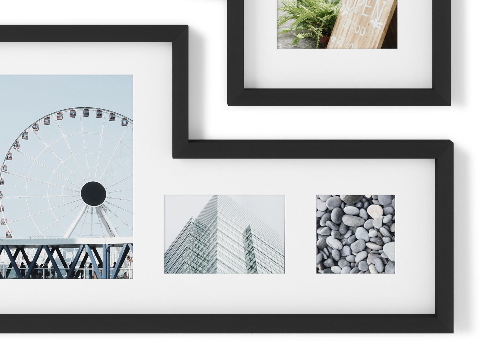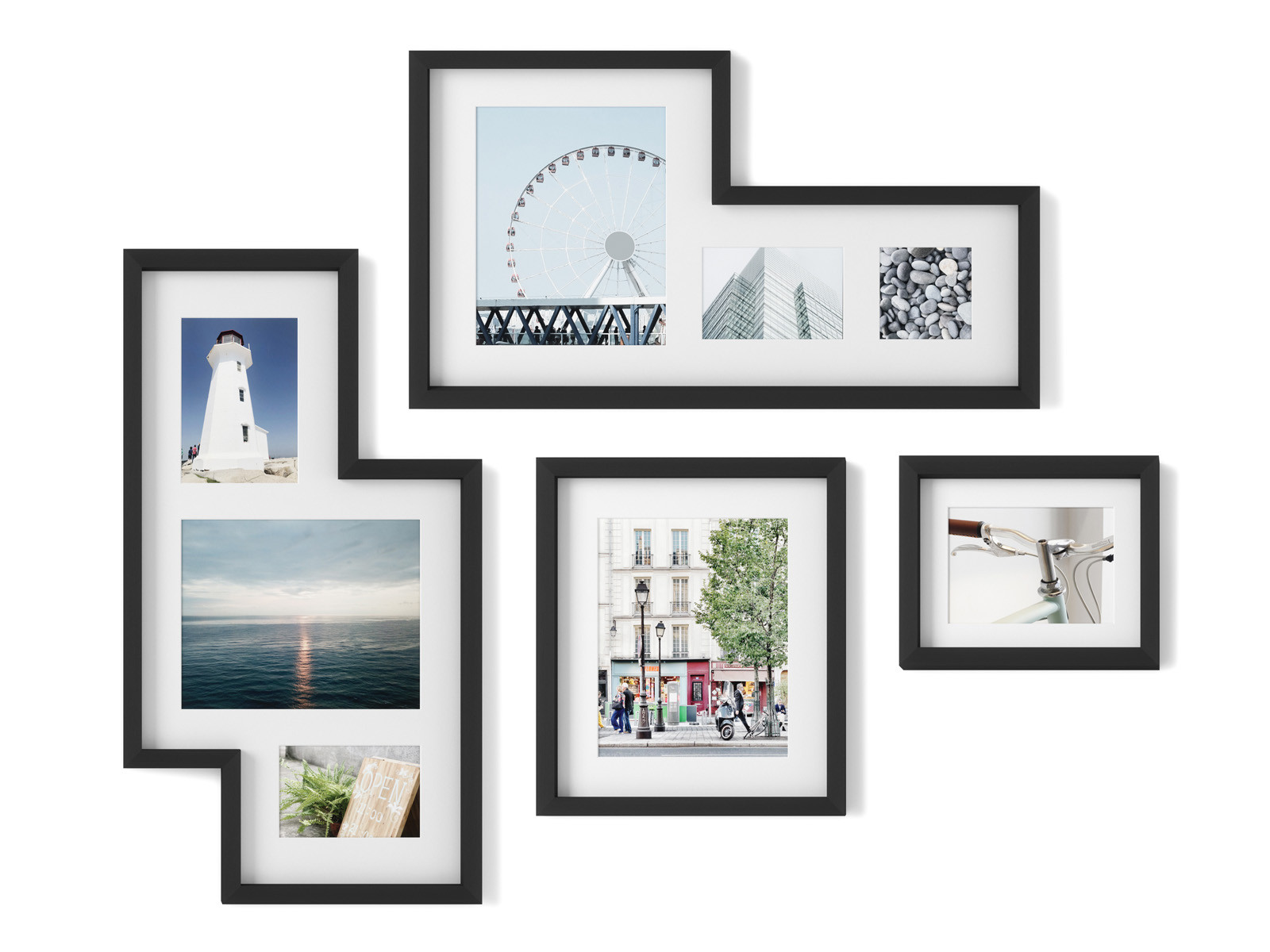 W zestawie znajdują się ramki o różnej wielkości do prezentacji zdjęć o 4-ech wielkościach: 3 zdjęć o wymiarach 20x25 cm, 2 zdjęć o wymiarach 13x18 cm, 2 zdjęć o wymiarach 10x15 cm oraz 1 zdjęcia o wymiarach 10x10 cm.