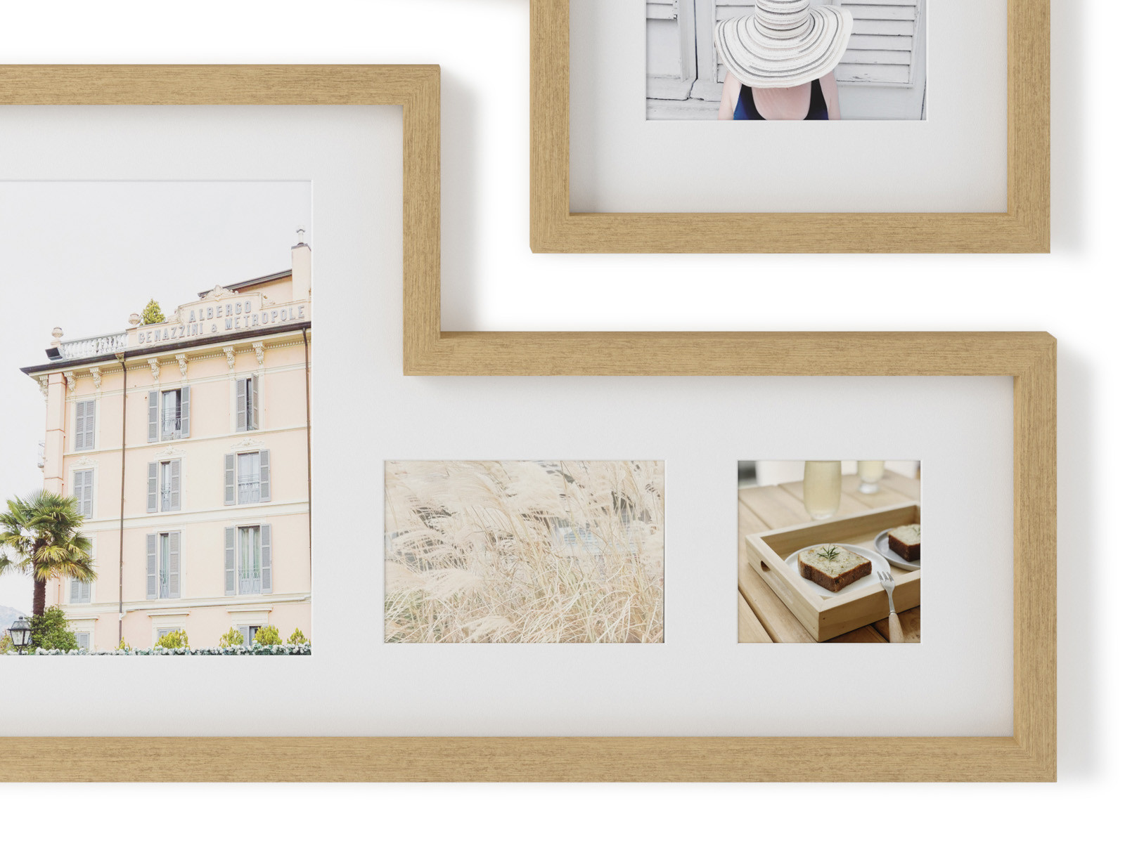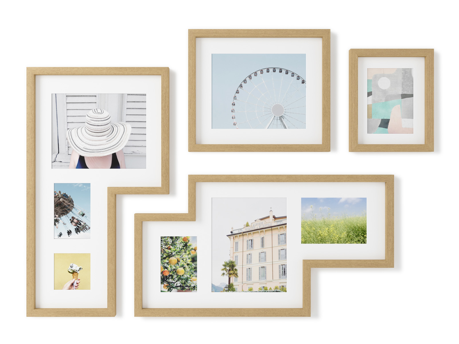 W zestawie znajdują się ramki o różnej wielkości do prezentacji zdjęć o 4-ech wielkościach: 3 zdjęć o wymiarach 20x25 cm, 2 zdjęć o wymiarach 13x18 cm, 2 zdjęć o wymiarach 10x15 cm oraz 1 zdjęcia o wymiarach 10x10 cm.