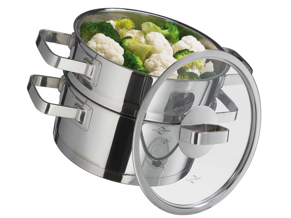 Garnek o pojemności 2,5 litra wykonany ze stali nierdzewnej, złożony z 3 części: podstawy klasycznego garnka, wkładu nadstawki z perforowanym dnem oraz szklanej pokrywki.