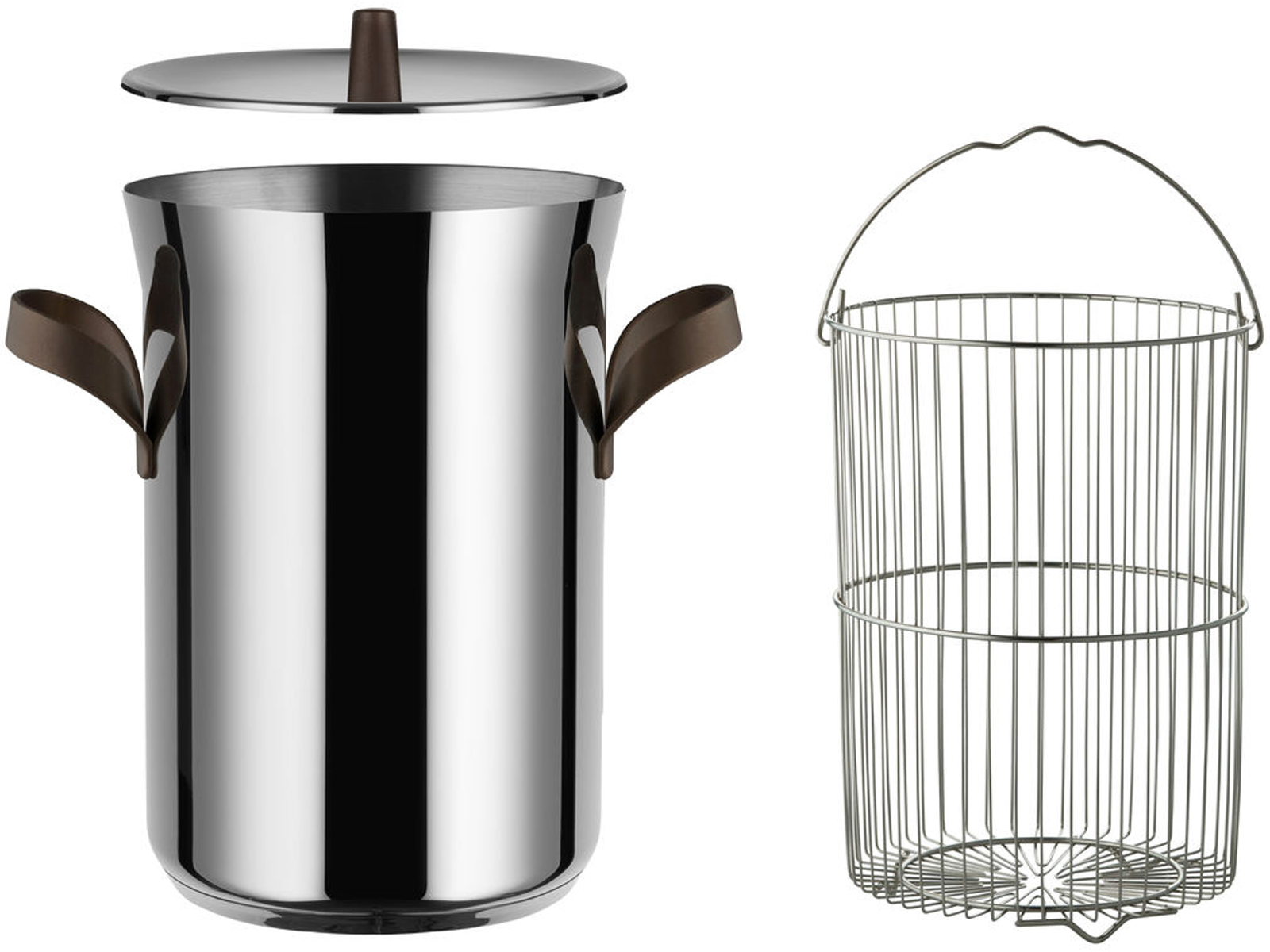 W komplecie znajduje się garnek, pokrywka stalowa i koszyk stalowy