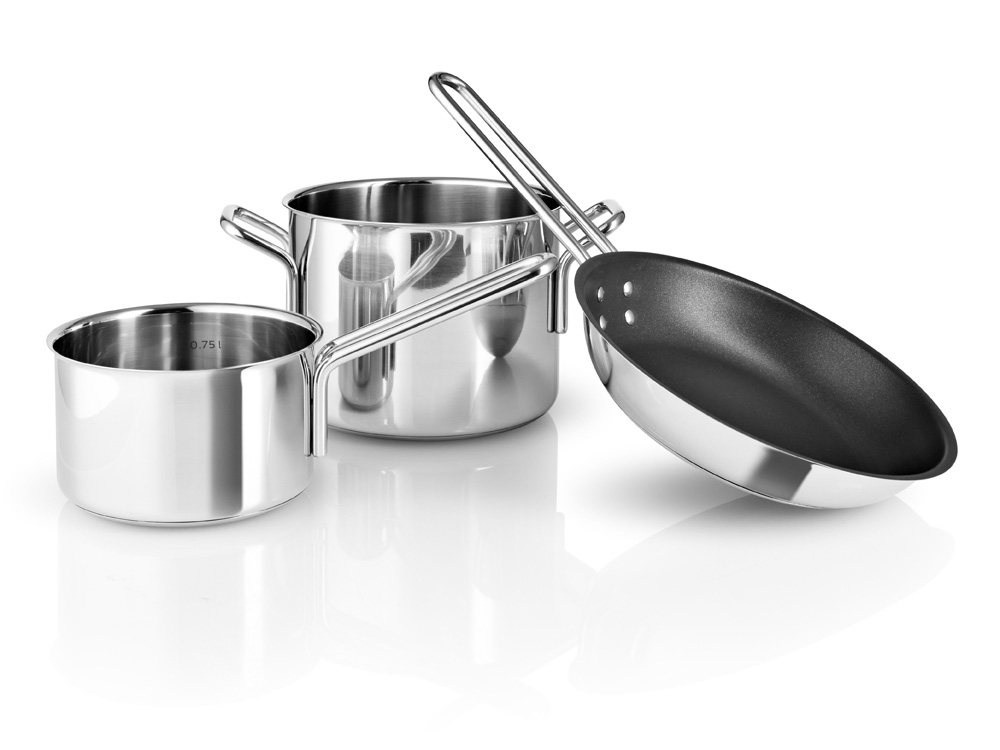 Garnki i patelnie z kolekcji Eva Solo Trio posiadają dno typu sandwich z aluminiowym rdzeniem zapewniającym szybkie i optymalne rozprowadzanie ciepła po dnie oraz bokach.