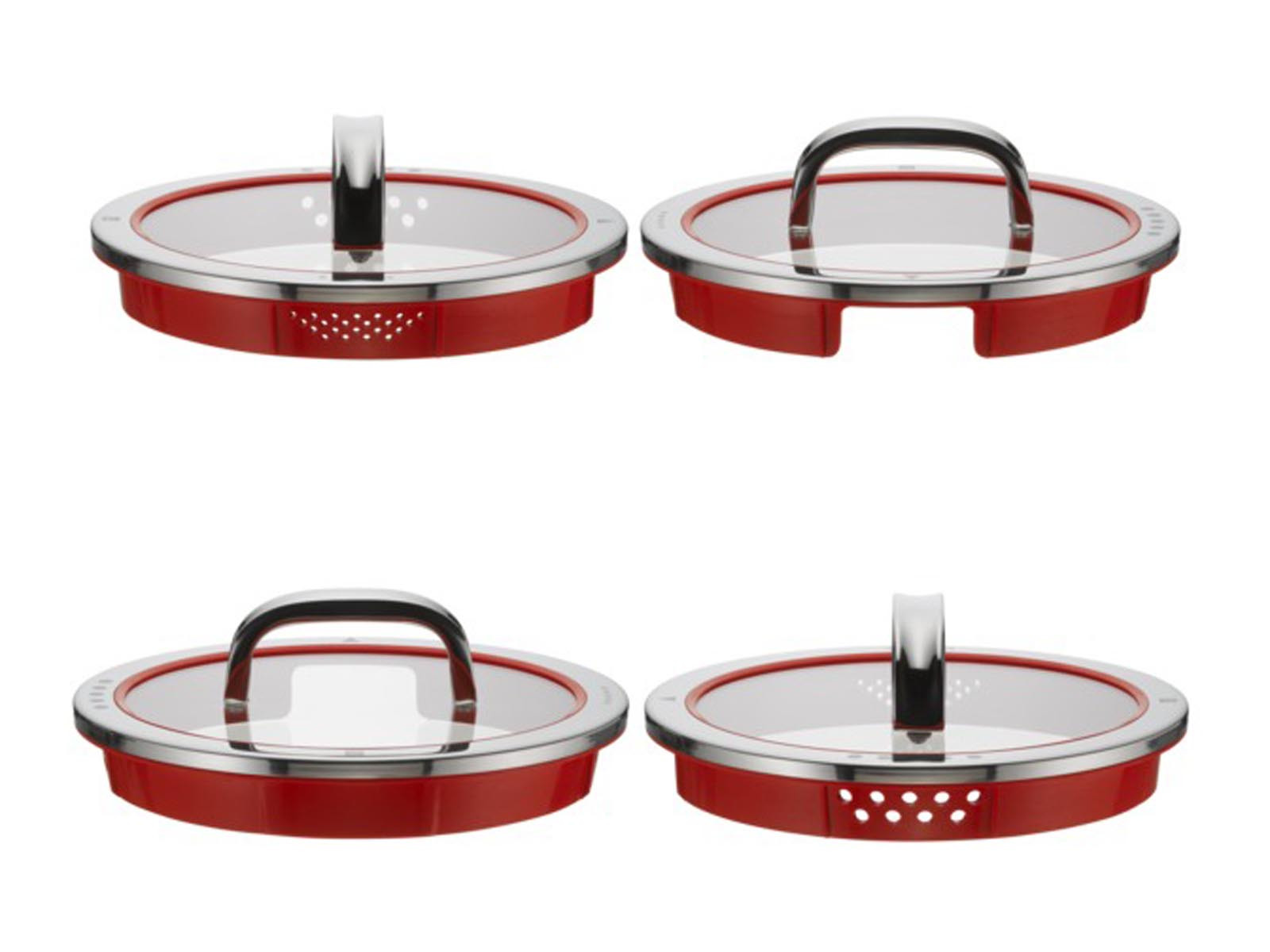Pokrywka szklana z uchwytem i brzegiem ze stali nierdzewnej oraz czerwonym pierścieniem wykonanym z silikonu, nie tylko pozwala w każdej chwili zajrzeć do wnętrza garnka, ale posiada również funkcje umożliwiające gotowanie oraz wylewanie płynów przy zamkniętym pokrywką garnku.