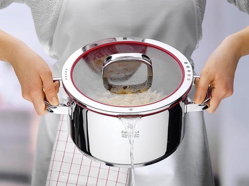 Brzeg pokrywki oznaczony jest 4-rema znacznikami, wybór jednego z nich poprzez jej przekręcenie umożliwia ustawienie silikonowego pierścienia w jednej z czterech pozycji: w zamkniętej do gotowania z małą ilością wody, w otwartej do całkowitego szybkiego odsączenia oraz w 2 pozycjach częściowo otwartych z dużym lub małym sitkiem do odsączania makaronu lub ryżu.
