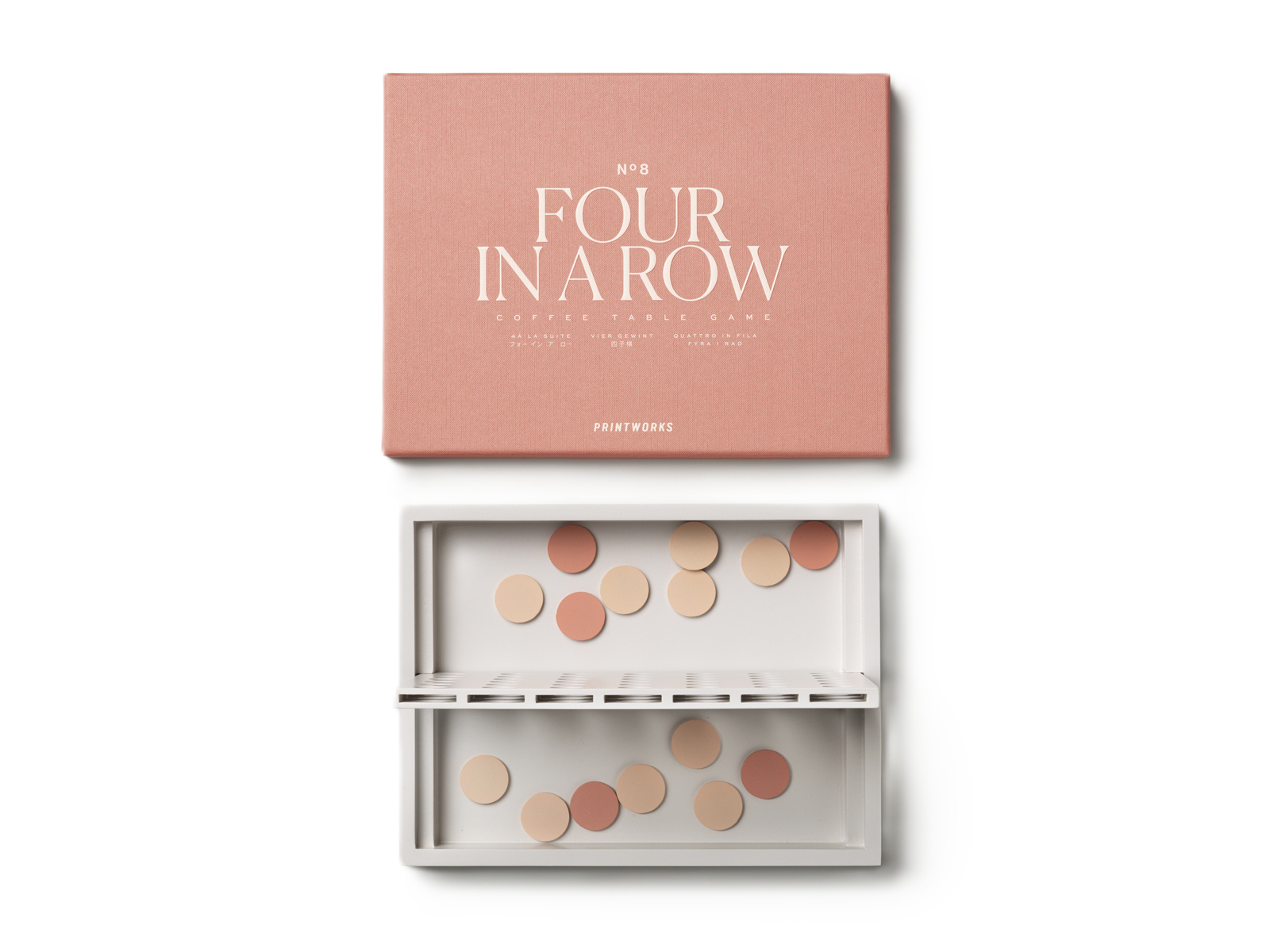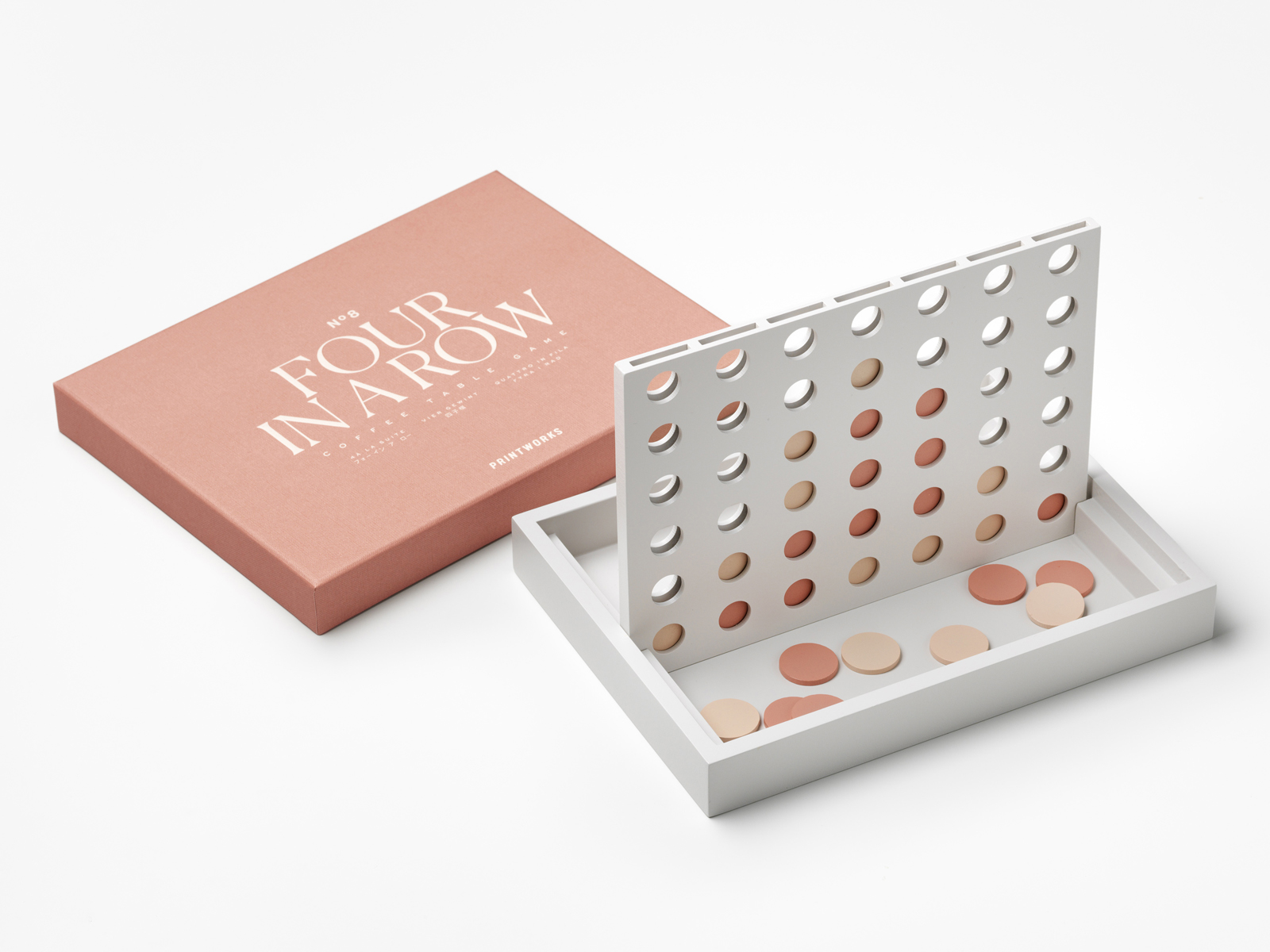 Four in a Row jest częścią kolekcji gier Classic, wyróżniającej się harmonijną typografią o odpowiednio dobranej, stonowanej palecie barw. Poza godzinami świetnej rozrywki w rodzinnym gronie zaoferuje też inspirację artystyczną formą, która stanie się ozdobą na kominkach, regałach, kredensach i stolikach kawowych. Podobnie jak inne gry Printworks, dzięki wysokim walorom estetycznym jest kreatywnym pomysłem na angażujący, a jednocześnie pięknie zdobiony prezent na każdą okazję. Opakowanie każdego zestawu przykuwa wzrok, zapada głęboko w pamięć i przechowuje elementy do zabawy, która budzi szczególny sentyment. Dodatkowo, doskonale prezentuje się we wszystkich wnętrzach.