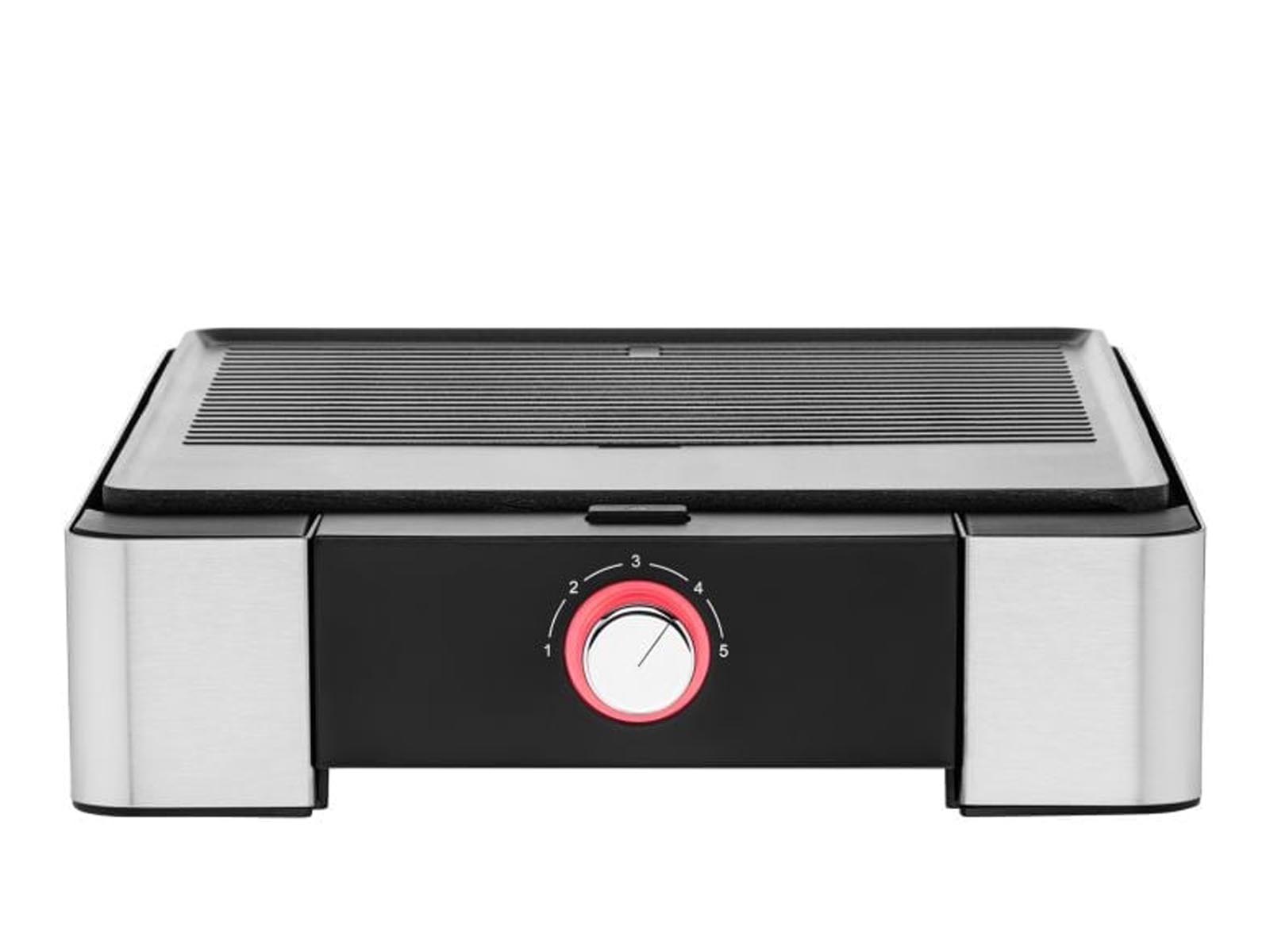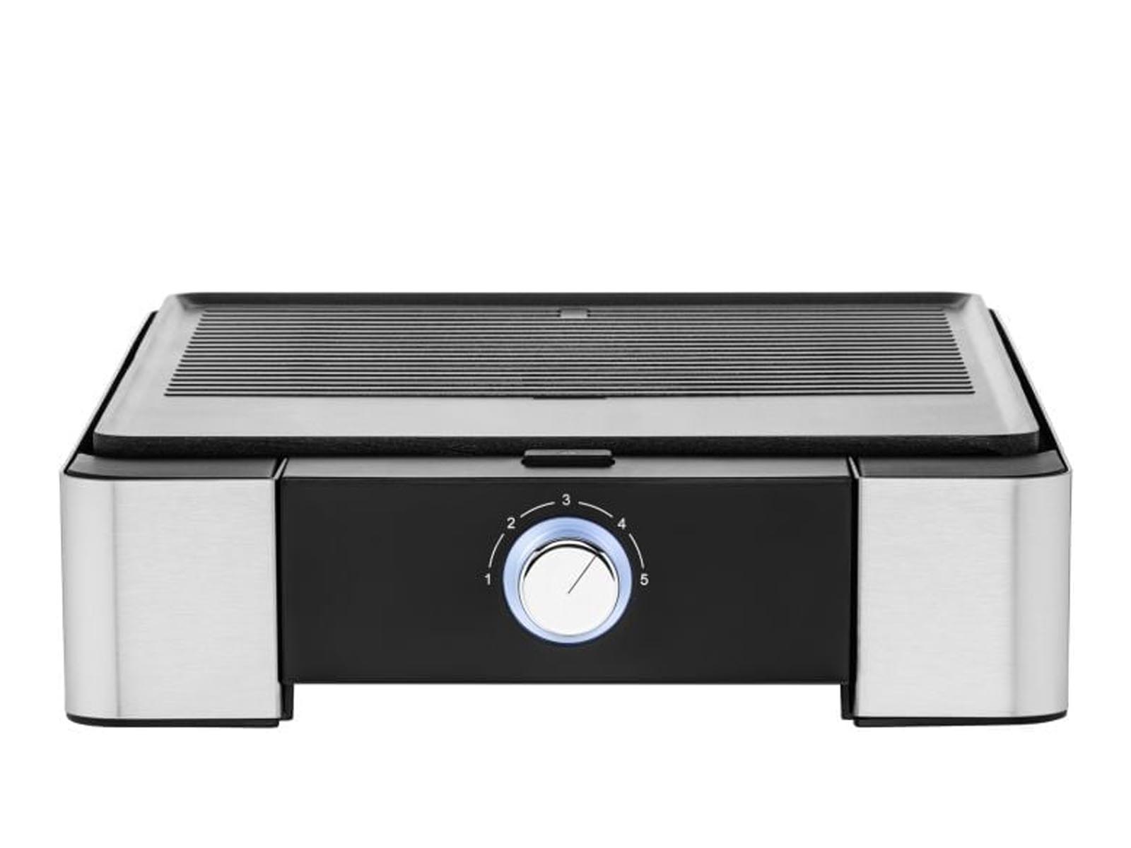 Elegancki stołowy grill elektryczny do użytku wewnątrz pomieszczeń, umożliwia bezpieczne grillowanie produktów na kuchennym blacie lub jadalnianym stole.