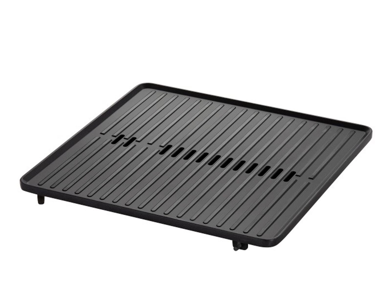 Grill posiada kwadratową strefę grillowania o regulowanej temperaturze, płyta grillowa o wielkości 27x27 cm żebrowana wykonana z aluminium z powłoką nieprzywieralną odporną na zarysowania - po naciśnięciu przycisku na obudowie płytę można łatwo zdjąć do umycia.