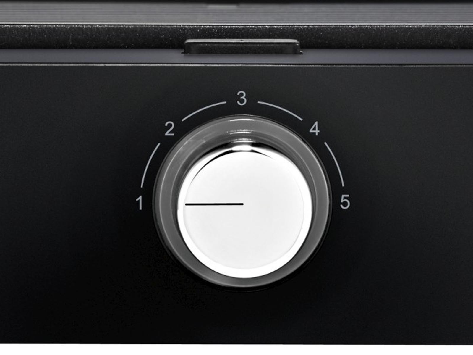 Na boku grilla znajduje się proste pokrętło z podświetleniem LED do regulacji temperatury nagrzewania płyty, pod spodem grilla umieszczony jest wysuwany ociekacz na tłuszcz i soki spływające z płyty.
