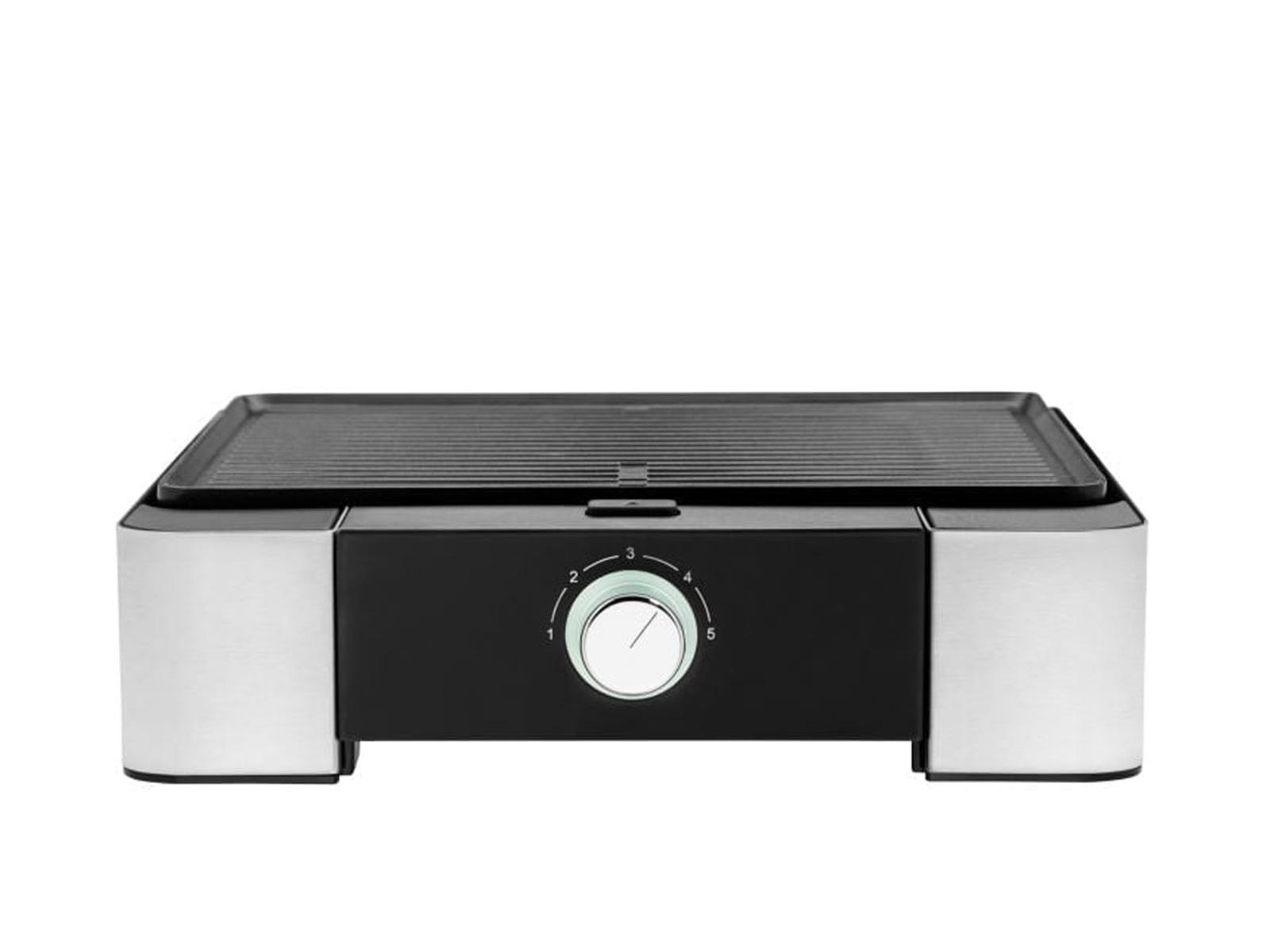 Elegancki kompaktowy stołowy grill elektryczny do użytku wewnątrz pomieszczeń, umożliwia bezpieczne grillowanie produktów na kuchennym blacie lub jadalnianym stole.
