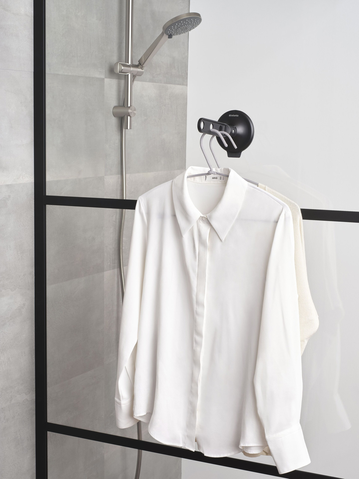 Praktyczny uniwersalny uchwyt do zawieszania wieszaków na ubrania, montowany bezinwazyjnie na gładkich pionowych powierzchniach.