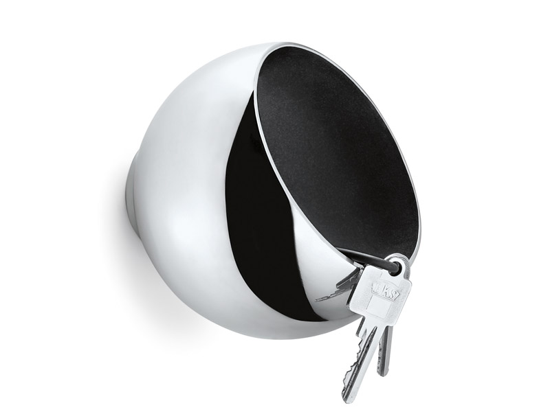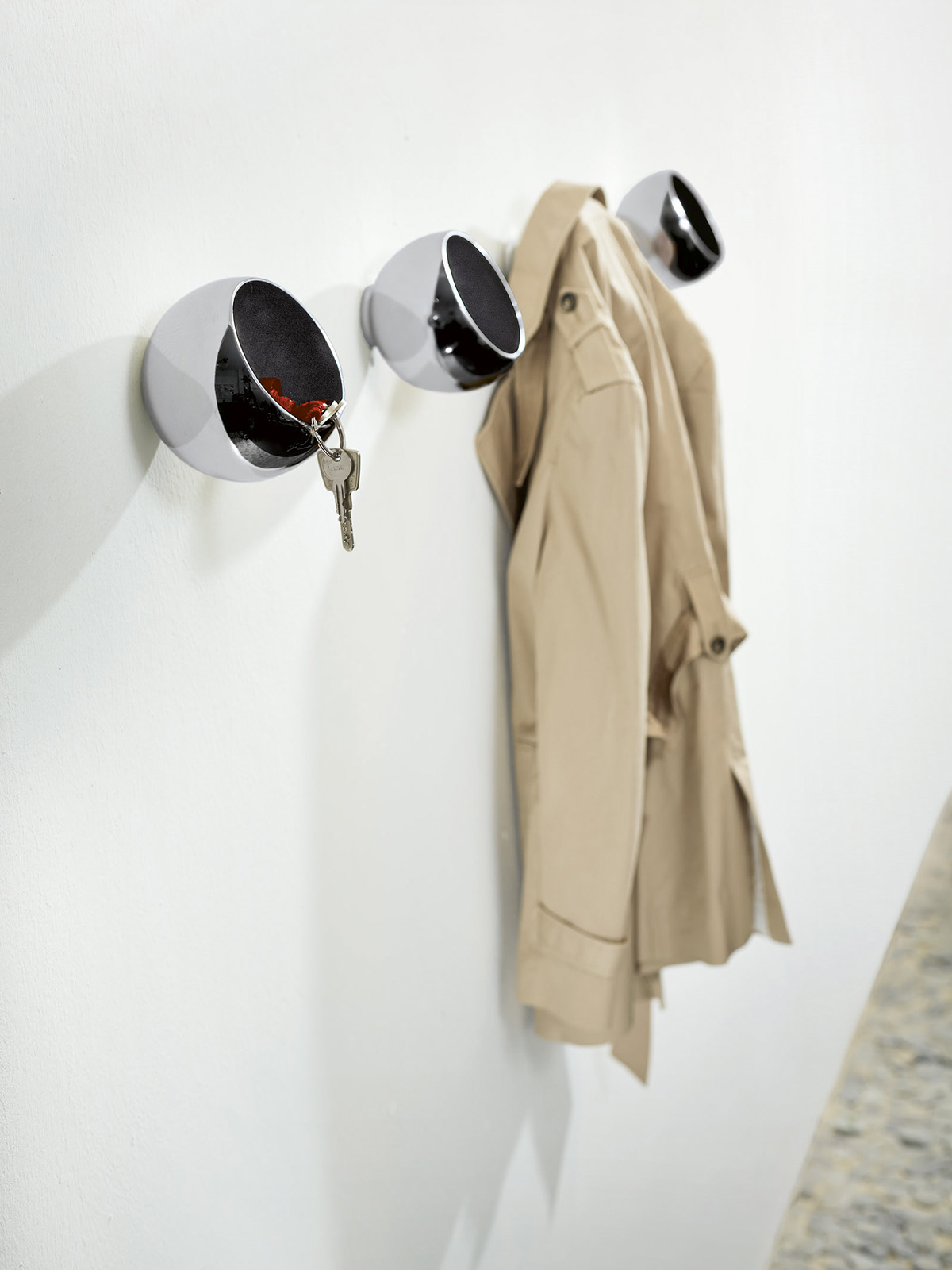 Dzięki kulistej konstrukcji o lekko ściętym boku, funkcjonalność wieszaka została rozszerzona o podręczny wewnętrzny schowek na rozmaite drobiazgi, które nosimy przy sobie i chcielibyśmy przechowywać w określonym miejscu.