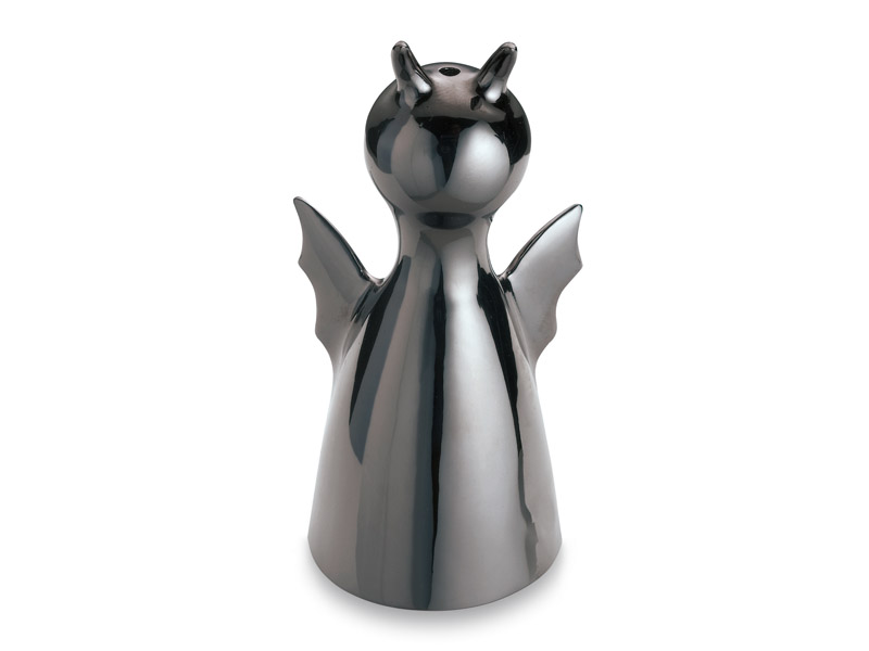 Pojemnik na pieprz mielony w kształcie diabełka z jednym otworem, wykonany z metalu pokrytego czarnym chromem.