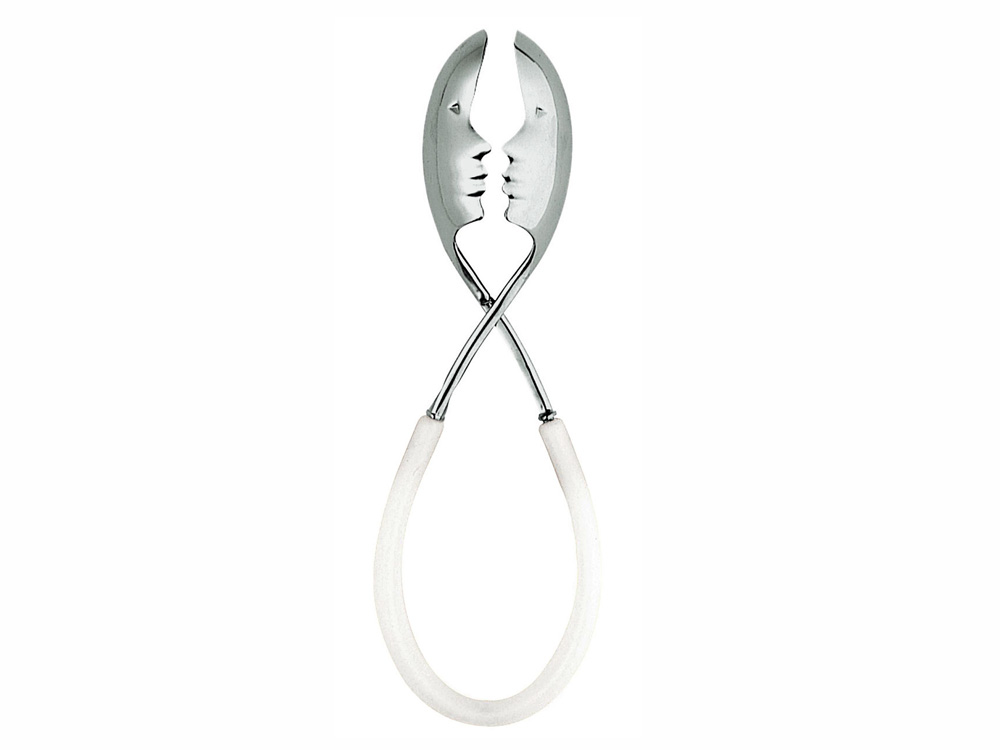 Eleganckie dekoracyjne metalowe szczypce do serwowania sałaty, warzyw i innych delikatnych potraw. Brzegi metalowych powierzchni chwytnych szczypiec w kształcie zbliżających się do pocałunku twarzy.