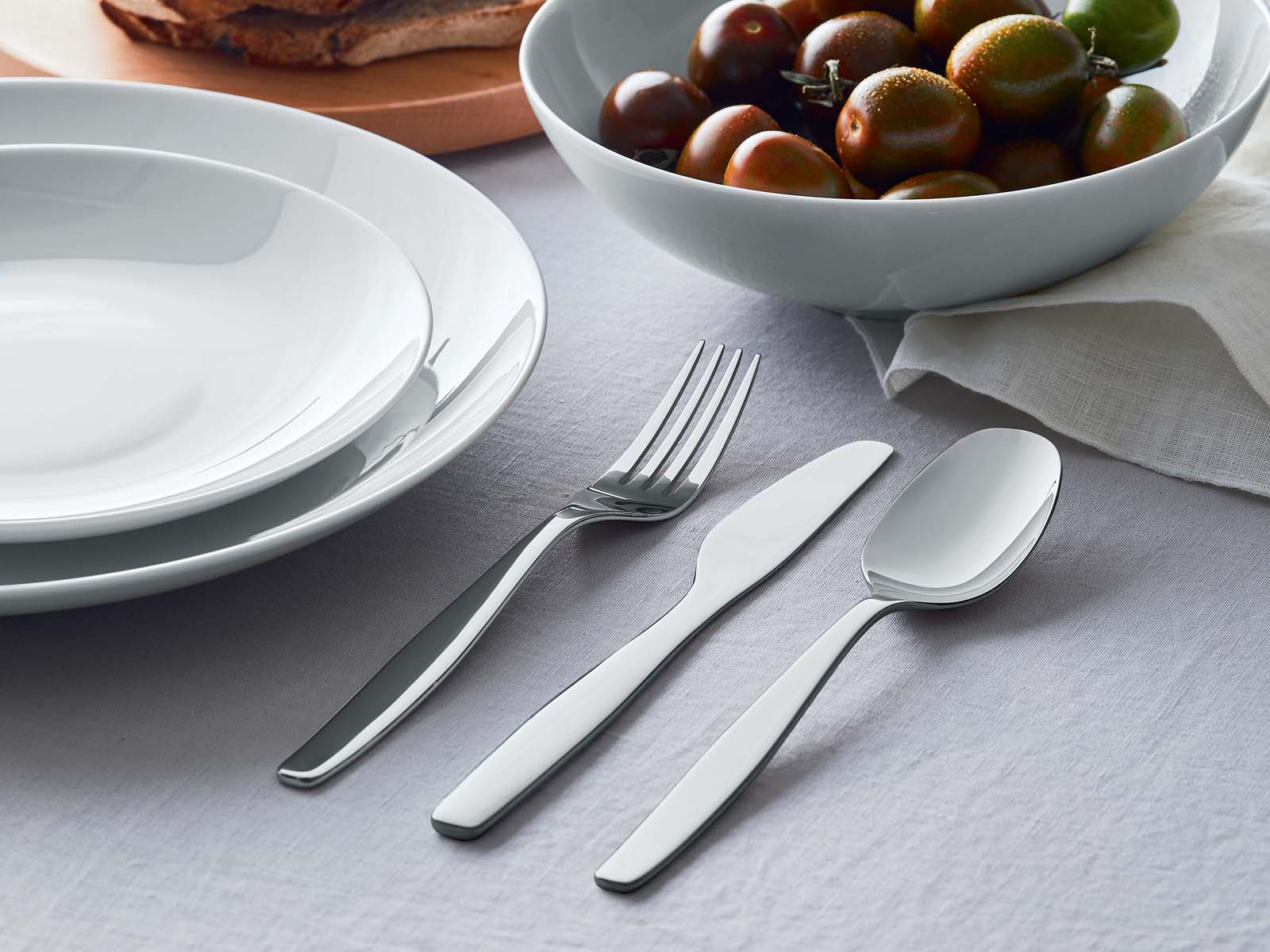 W obrębie kolekcji naczyń można wyróżnić 2 linie projektowe – uniwersalną, z gładkiej, białej porcelany oraz zdobioną Yunoki, z abstrakcyjnym, niebieskim wzorem autorstwa Samiro Yunokiego. Do obu wersji warto dopasować dedykowane sztućce serwisowe i stołowe o miękkich, wyprofilowanych formach z polerowanej stali nierdzewnej 18/10 lub AISI 420.
