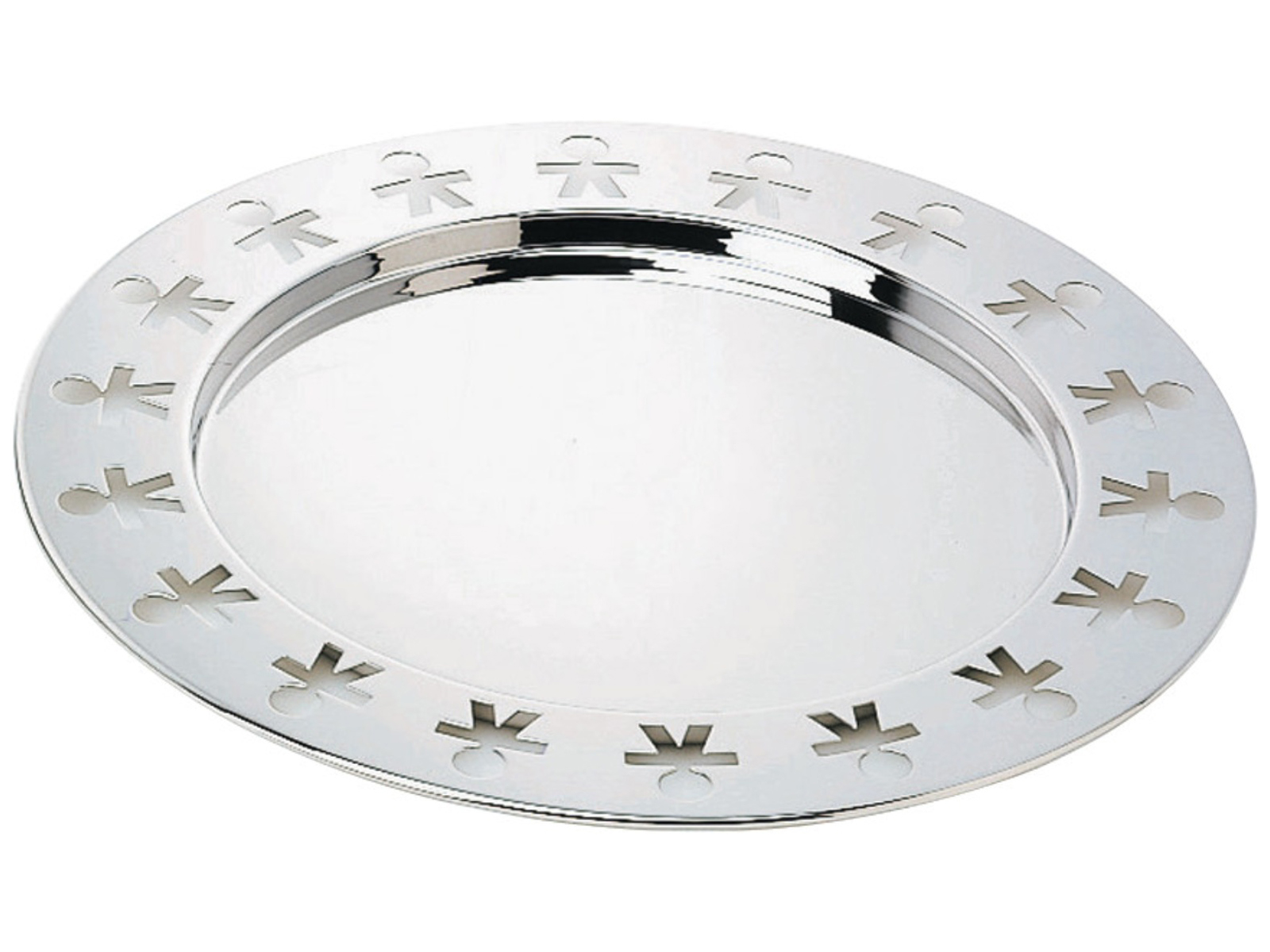 Ozdobna taca Girotondo przykuwa uwagę płaskim rantem z perforacjami w kształcie ludzików i krawędzią ciętą laserowo. Taca wykonana jest z wysokiej jakości polerowanej stali nierdzewnej 18/10 o lustrzanej powierzchni. Pełni przede wszystkim funkcję serwisową – wspaniale wyróżnia podawane gościom przystawki lub większe dania.