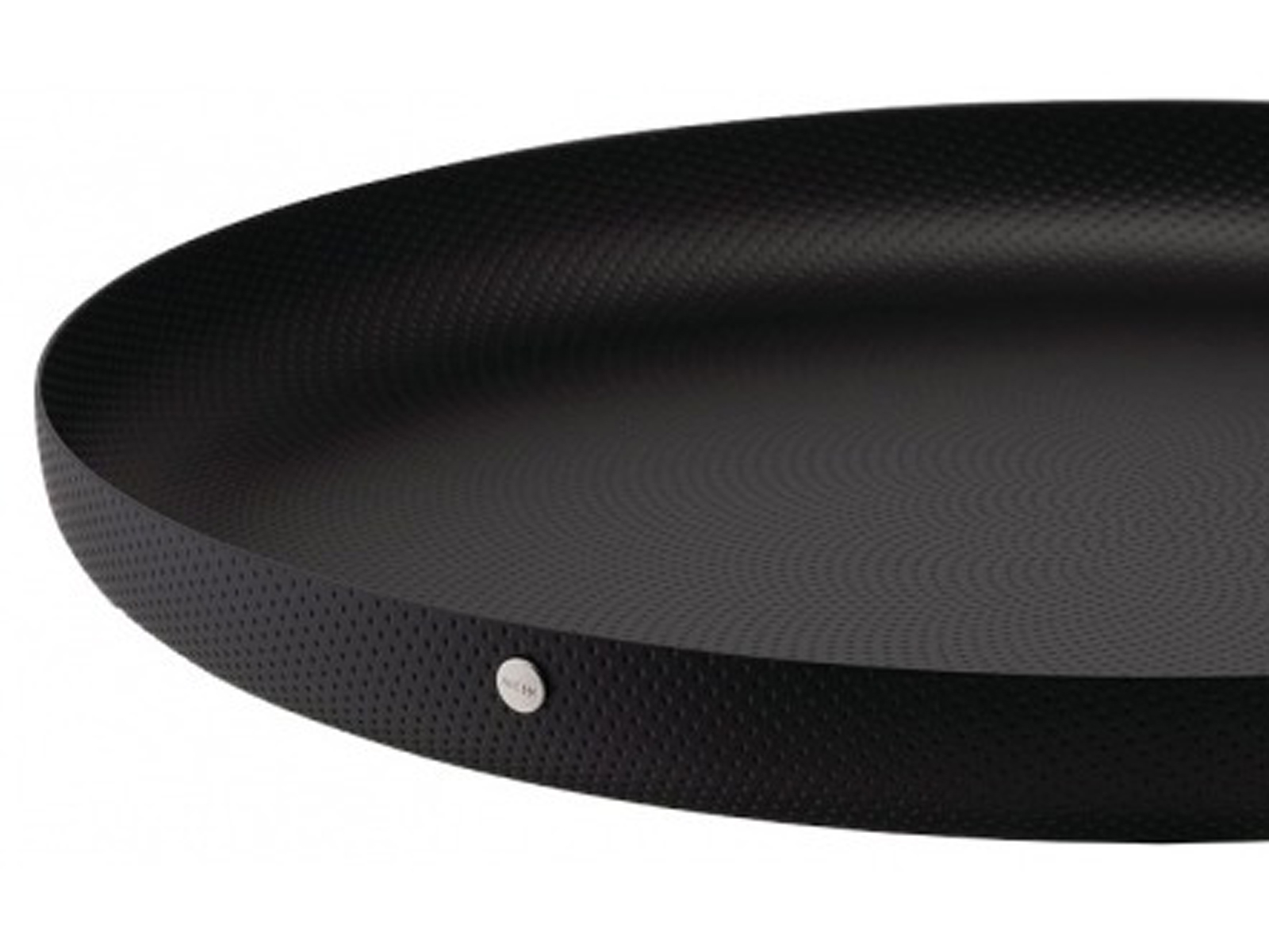Klasyczna okrągła taca do serwowania w minimalistycznej, prostej stylizacji. Taca wykonana jest z barwionej żywicą epoksydową stali nierdzewnej 18/10, odpornej na działanie kwasów oraz zarysowania. Posiada matową powierzchnię o zwiększonej granulacji, zdobioną eleganckim reliefem.