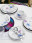 Biała porcelana z szarym, różowym i niebieskim wzorem