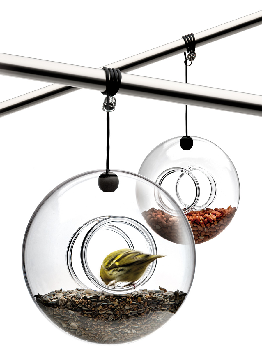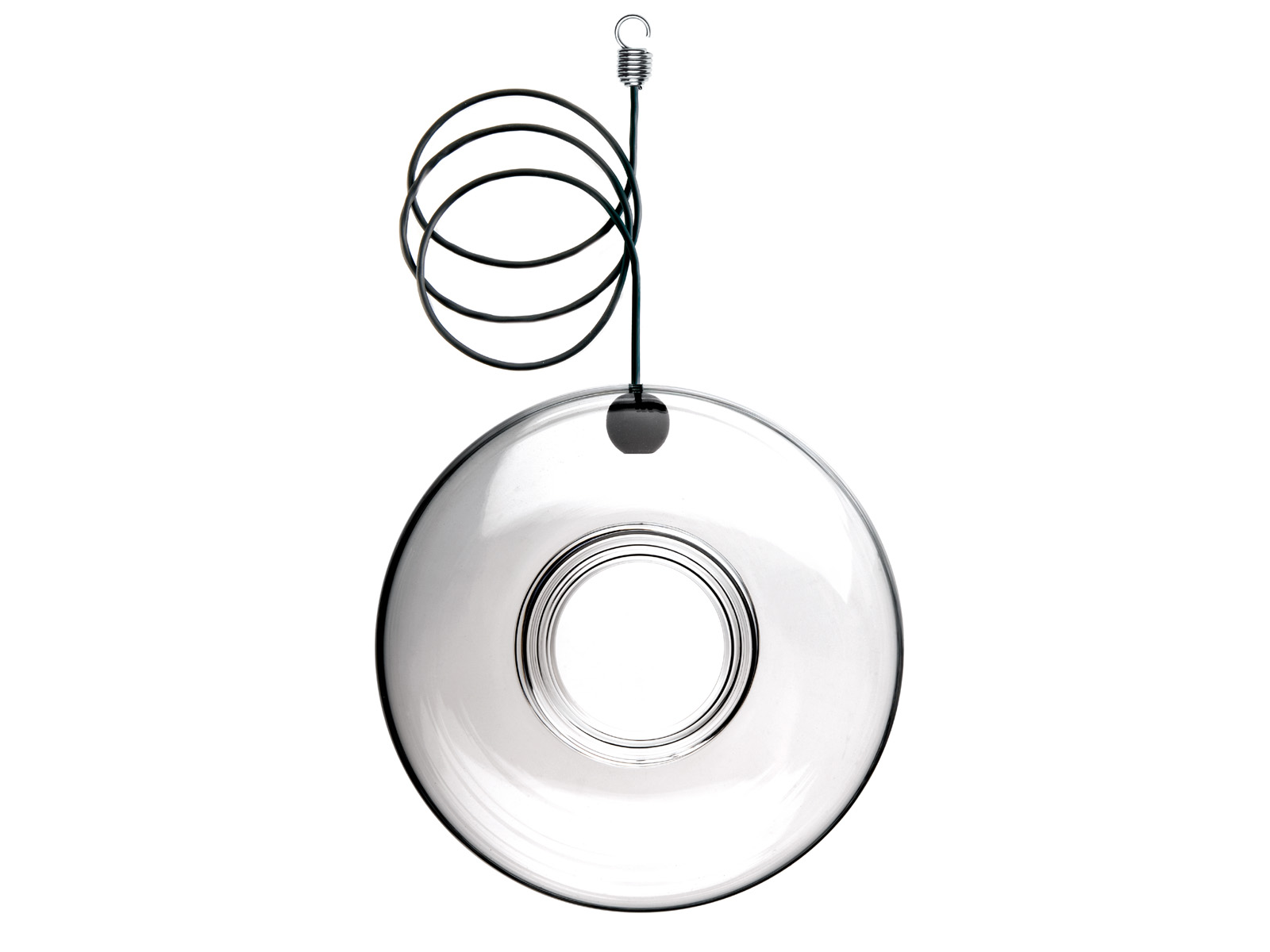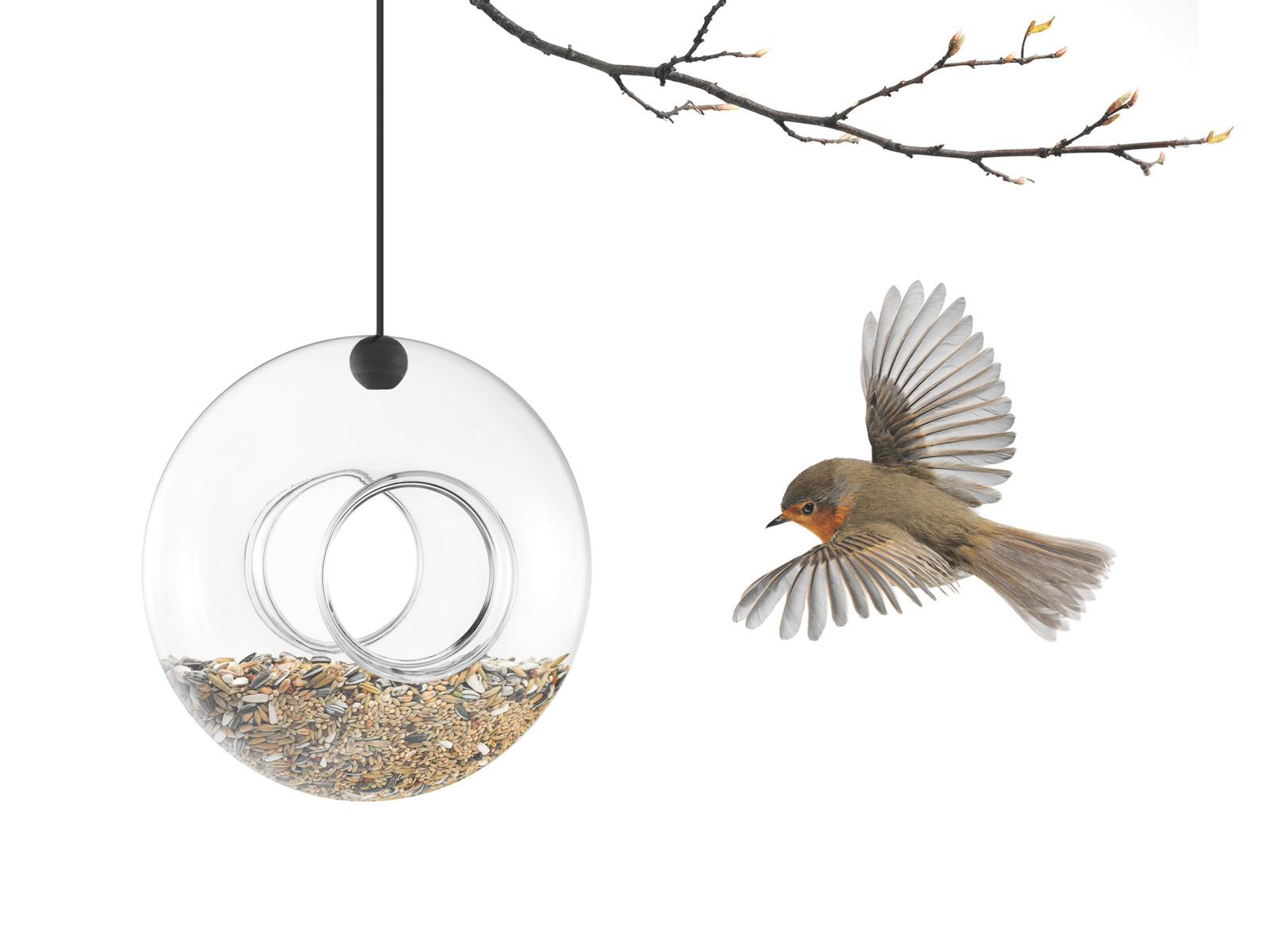 Karmnik w kulistym kształcie z bezbarwnego przezroczystego szkła dmuchanego z dwoma okrągłymi otworami wejściowymi, zaprojektowany tak, aby niewielkie ptaki mogły łatwo usiąść na szklanej krawędzi wejścia i jeść.