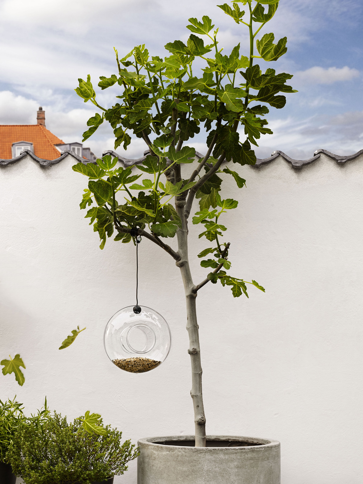 Elegancki dekoracyjny szklany karmnik dla ptaków do zawieszania w ogrodzie lub na balkonie.
