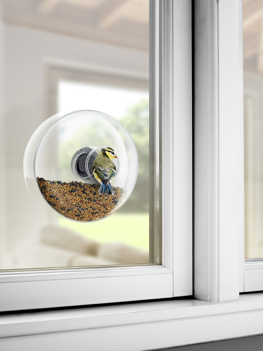 Elegancki okrągły karmnik dla małych ptaków przyklejany pionowo na zewnętrznej stronie okna.