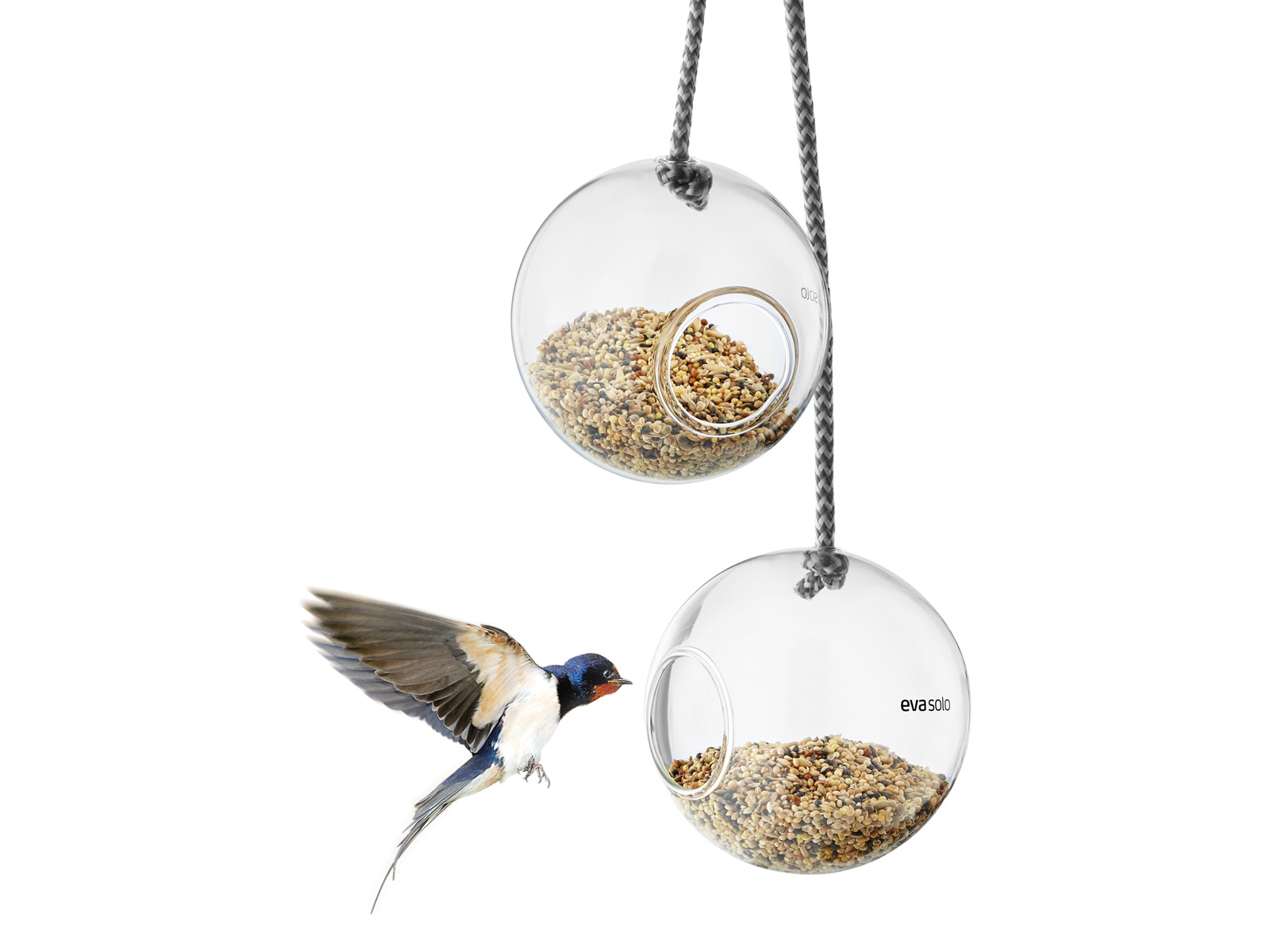 Elegancki dekoracyjny karmnik dla ptaków z dwoma kulistymi pojemnikami na karmę połączonymi nylonowym sznurem do zawieszania w ogrodzie lub na balkonie.