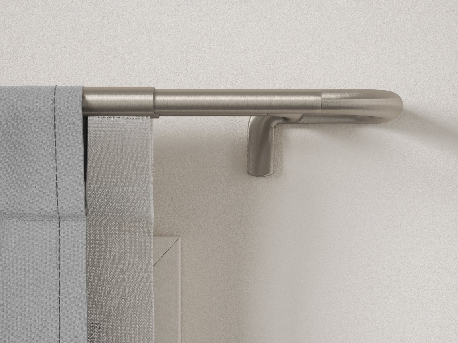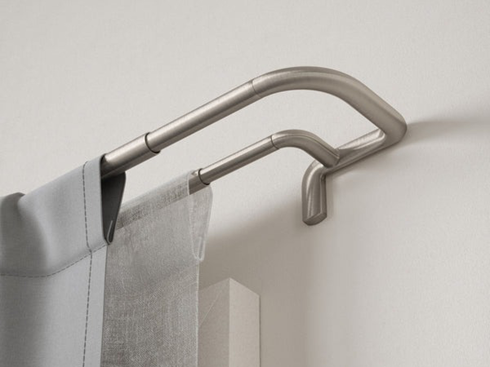 Poprzeczka karnisza zewnętrzna do zasłon o średnicy 1,9 cm, poprzeczka wewnętrzna do firan o średnicy 1,5 cm, zakończone po obu stronach wygięciem, które zapewnia zaciągniecie firan i zasłon do samej ściany.
