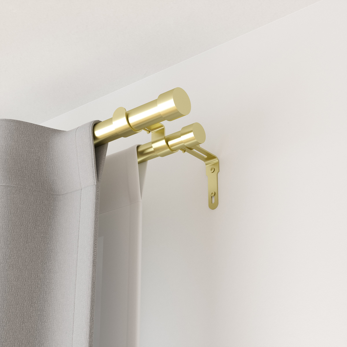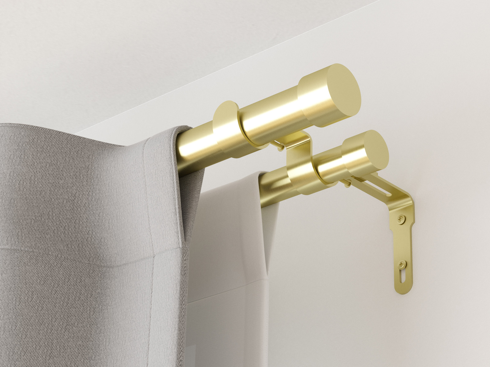 Karnisz wykonany z wysokiej jakości metalu w wykończeniu mosiężnym, z dwoma solidnymi drążkami - przedni drążek o średnicy 2,5 cm, tylni o średnicy 1,9 cm, oba zakończone minimalistycznymi cylindrycznymi końcówkami.