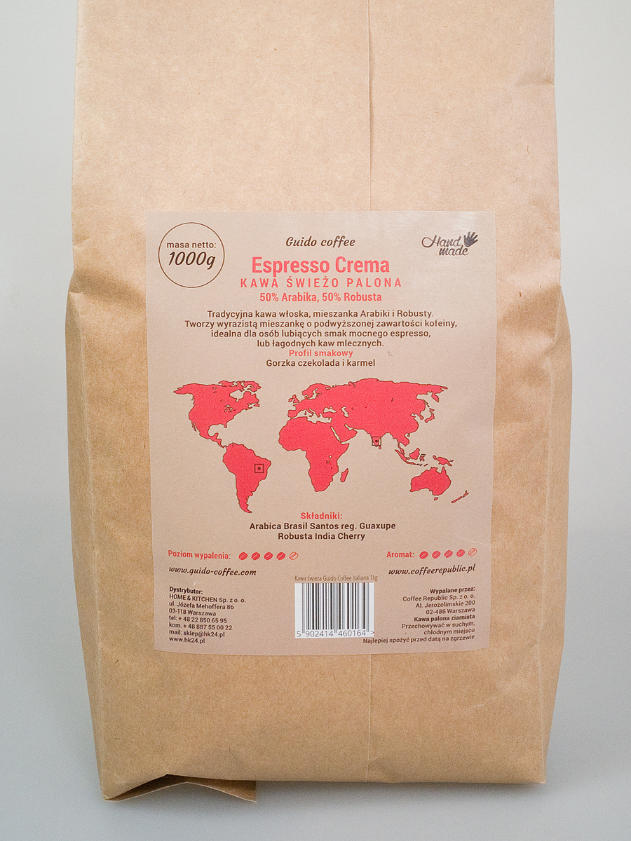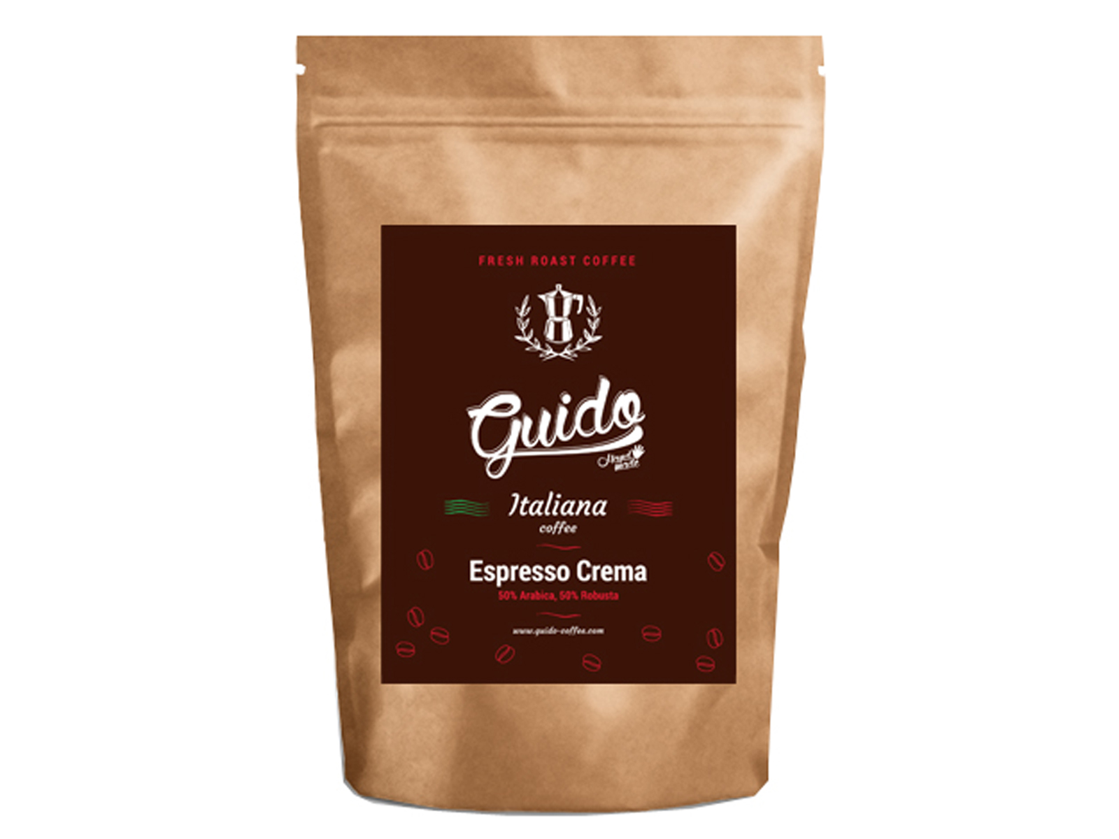 Guido Coffee Italiana Espresso Crema to wyjątkowa świeżo palona kawa w stylu włoskim, stworzona z najwyższej jakości ziaren arabiki z Brazylii Santos i robusty India Cherry.
