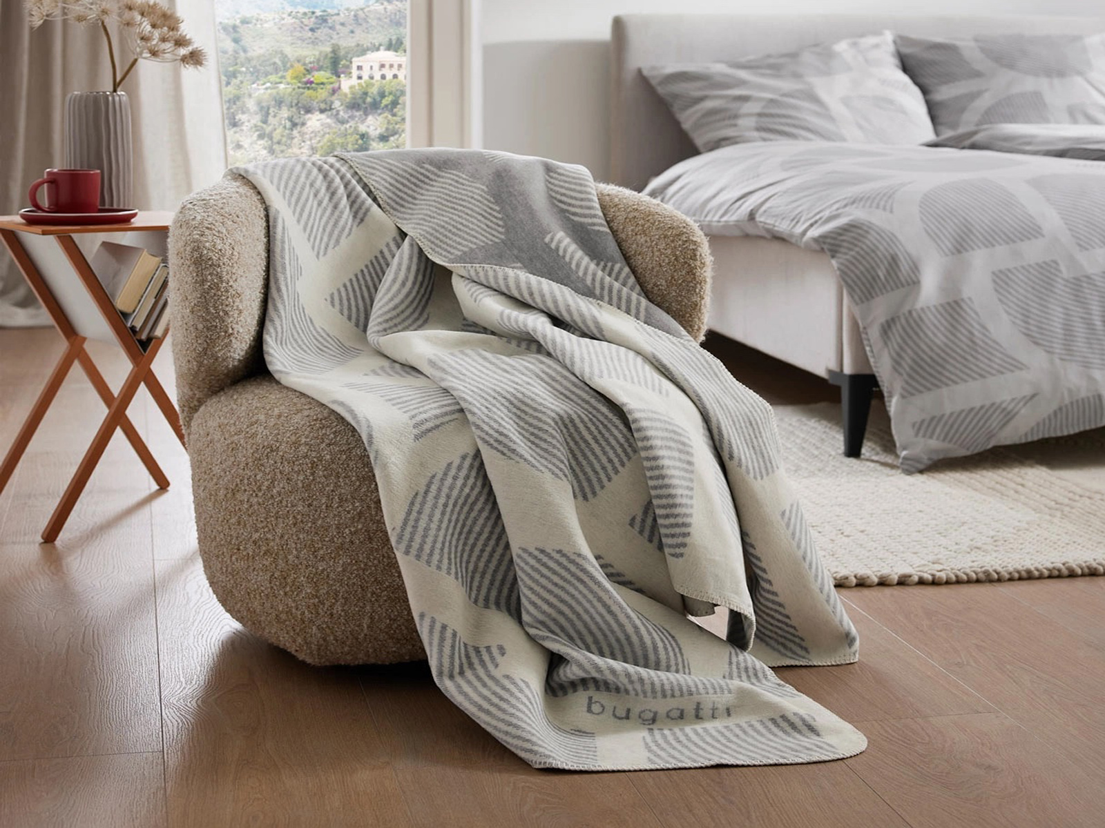 Koce Bugatti Jacqaurd to klasyczne koce wykonane z popularnej mieszanki bawełny i akrylu, dzięki której są przytulne i bardzo miłe i delikatne w dotyku. Zapewniają wysoki komfort cieplny i nadają się zdecydowanie na chłodniejsze dni.