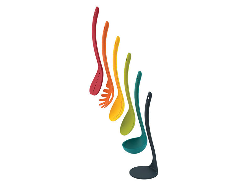 Oryginalny i świetnie zaprojektowany zbiór podstawowych narzędzi kuchennych zawieszonych na funkcjonalnym stojaku, zawsze znajduję się pod ręką i zajmuje minimalną powierzchnię kuchennego blatu.