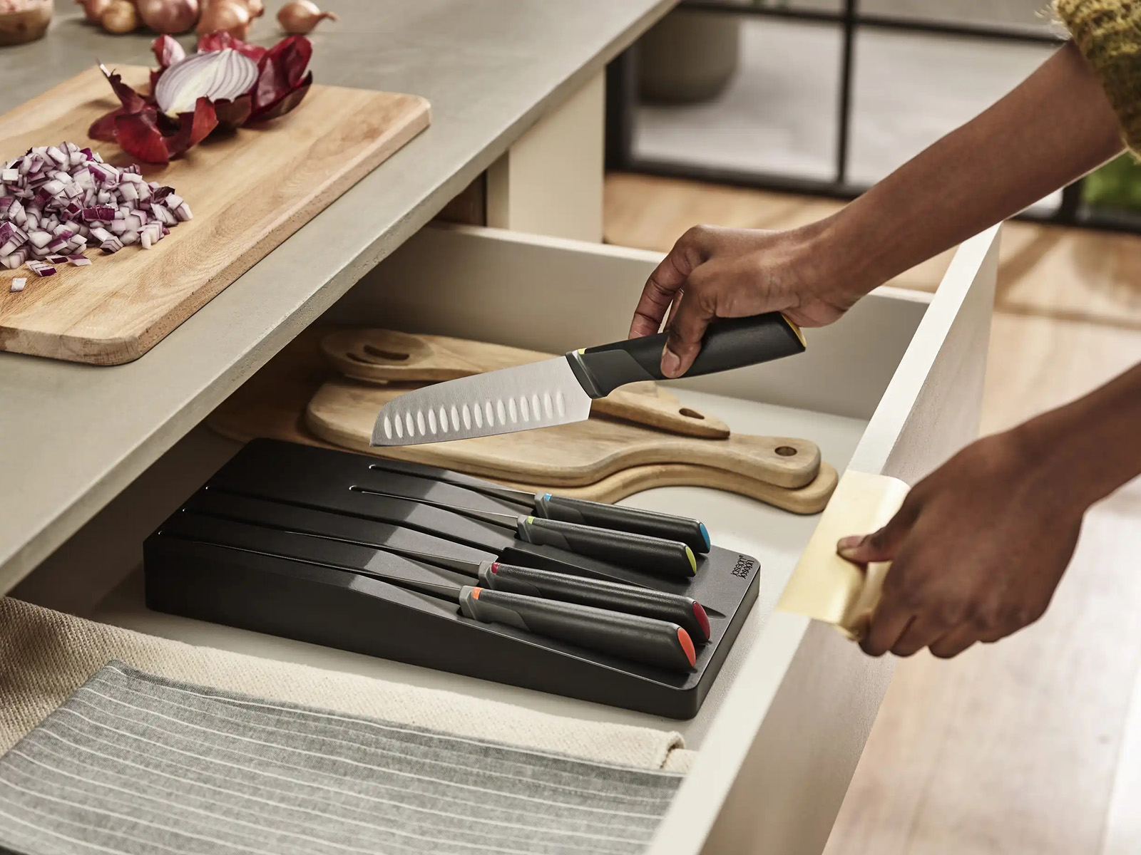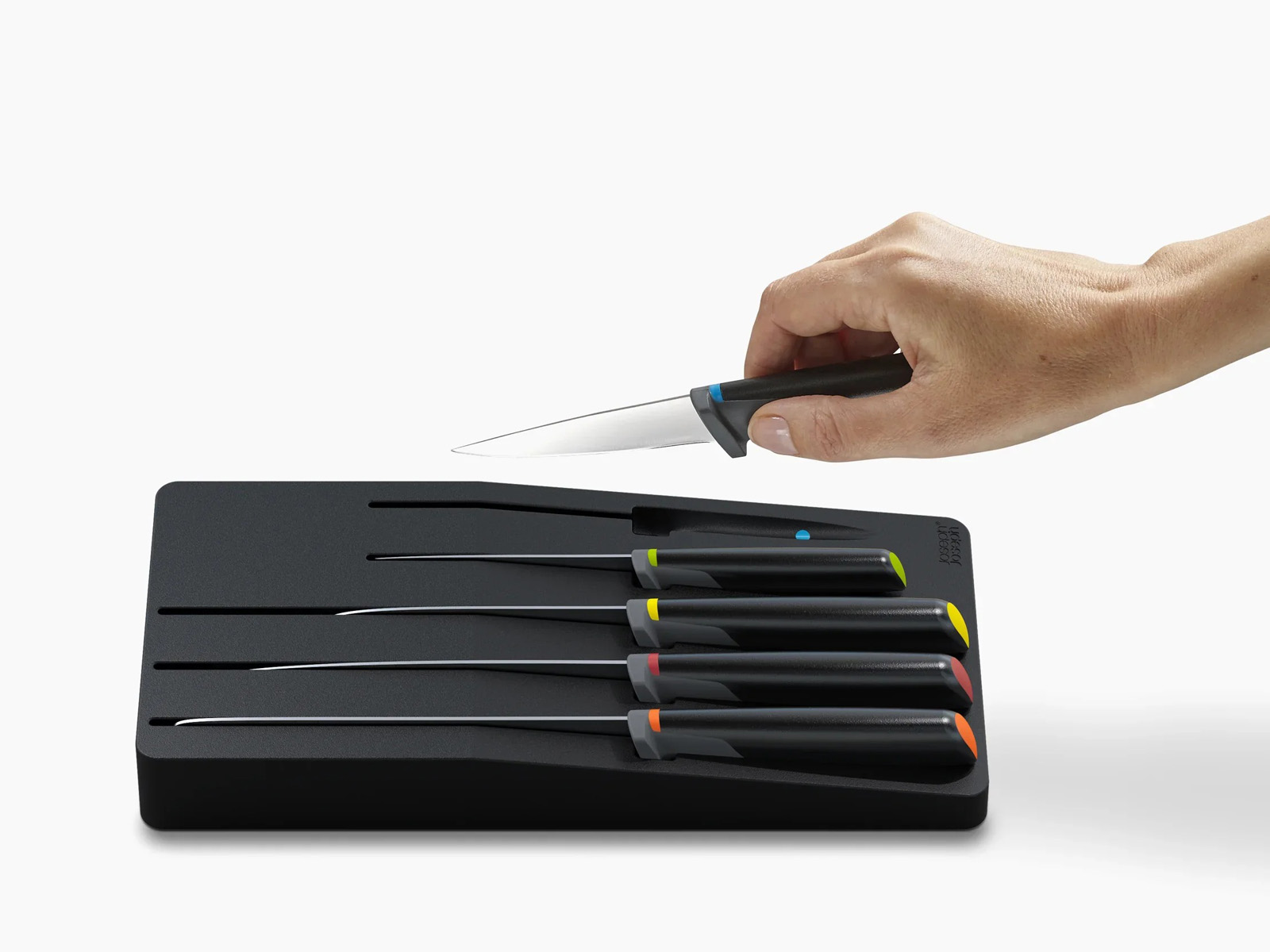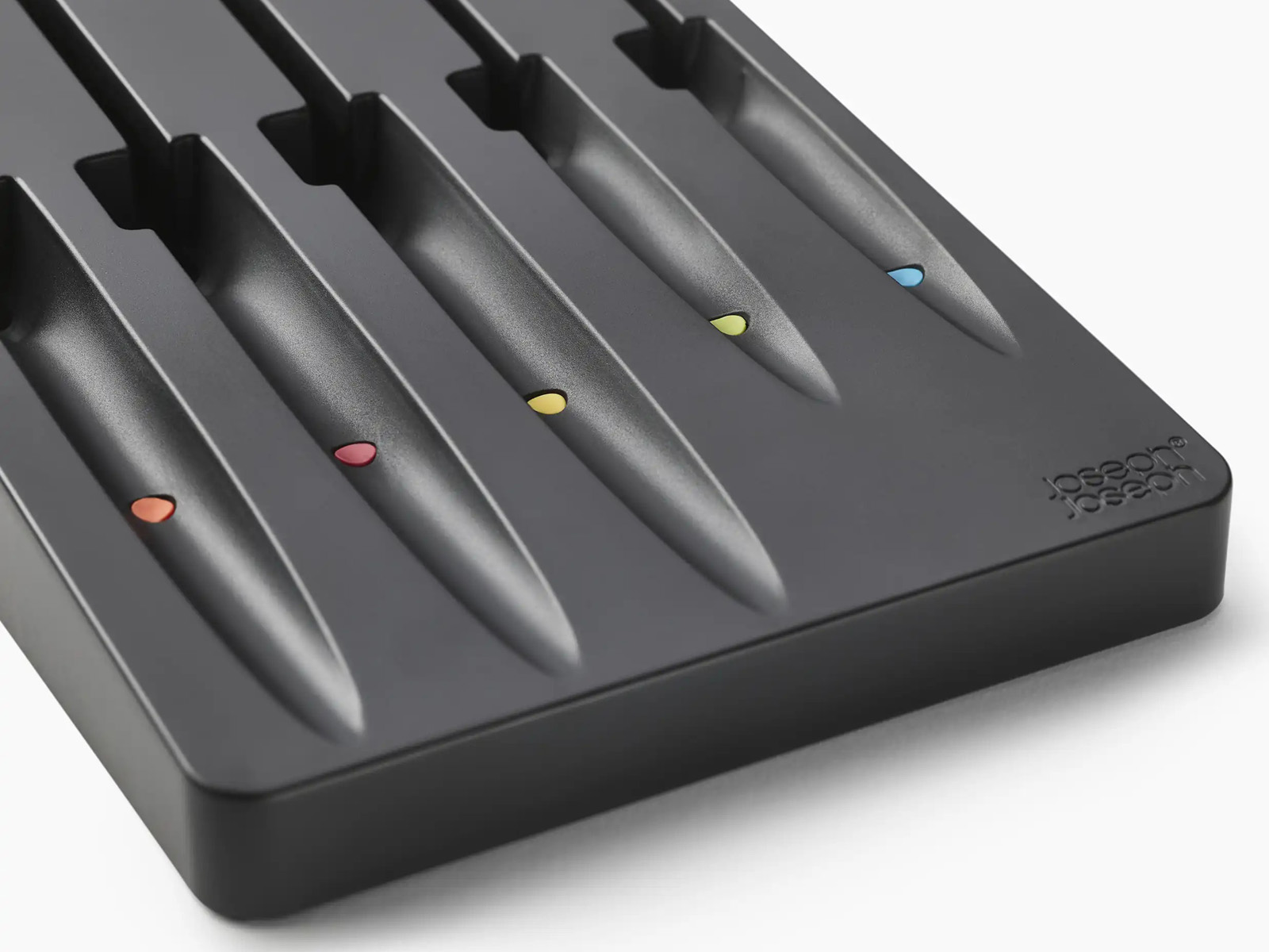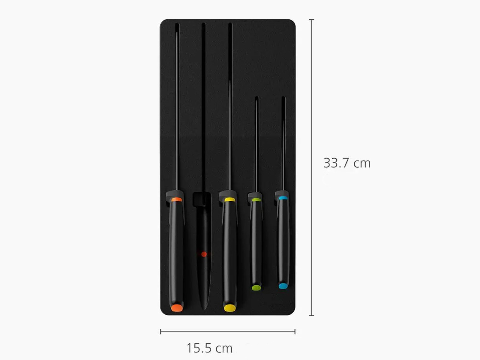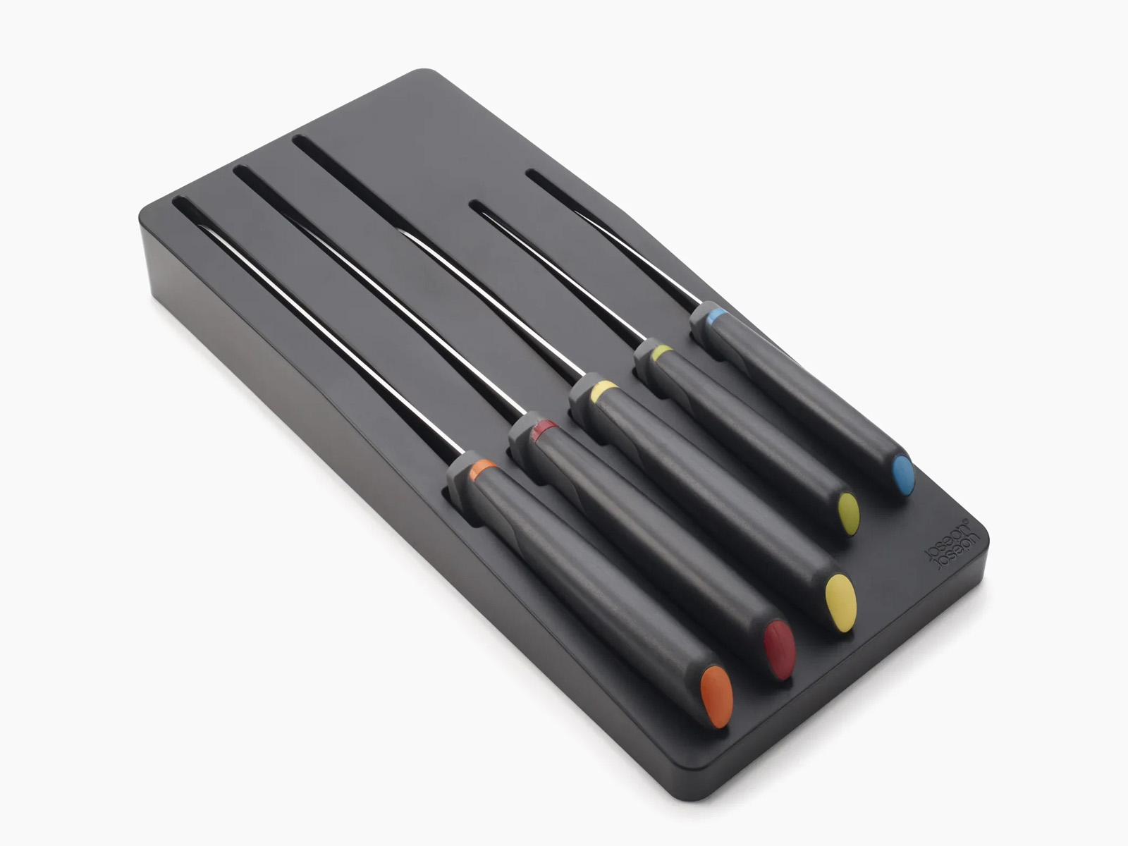 Oryginalny i praktyczny komplet 5-ciu noży kuchennych z płaskim organizerem do ich bezpiecznego przechowywania w szufladzie.
