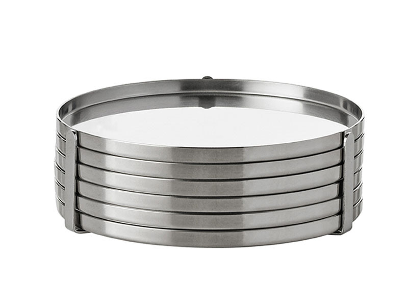 Komplet 6-ściu eleganckich okrągłych podstawek pod szklanki ze stojakiem do ich przechowywania.