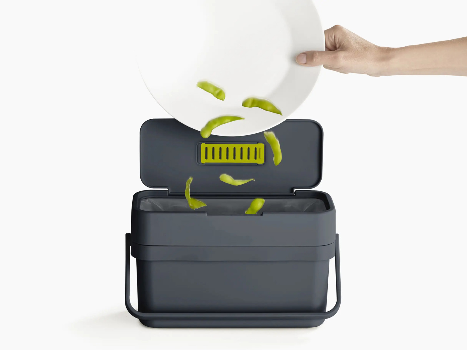 Kosz wykonany z tworzywa sztucznego wolnego od BPA, posiada szeroki otwór wlotowy ułatwiający zsuwania resztek jedzenia wprost z talerza oraz wygodny uchwyt do przenoszenia.