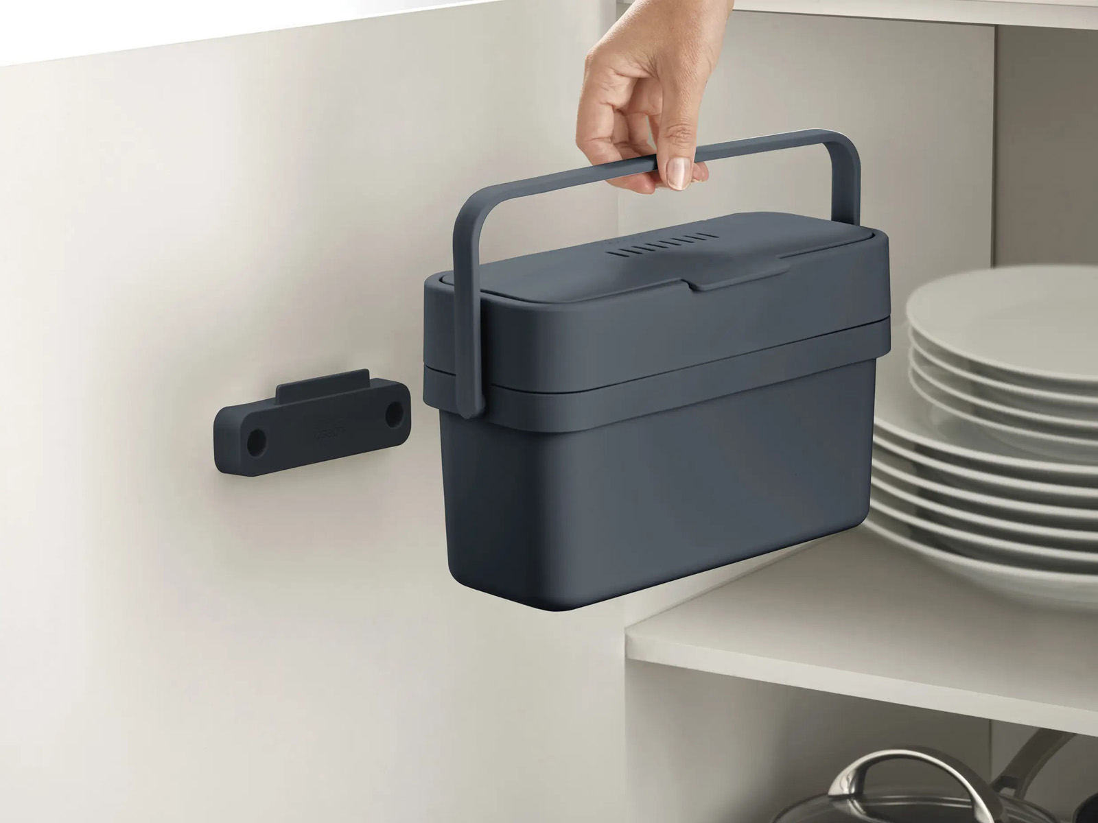 Pojemnik kosza w prostokątnym smukłym kształcie idealnym do przechowywanie go w wewnątrz szafki kuchennej - w zestawie znajduje się uchwyt do montażu na wewnętrznej stroni drzwi szafki umożliwiający zawieszania na nim kompostownika.