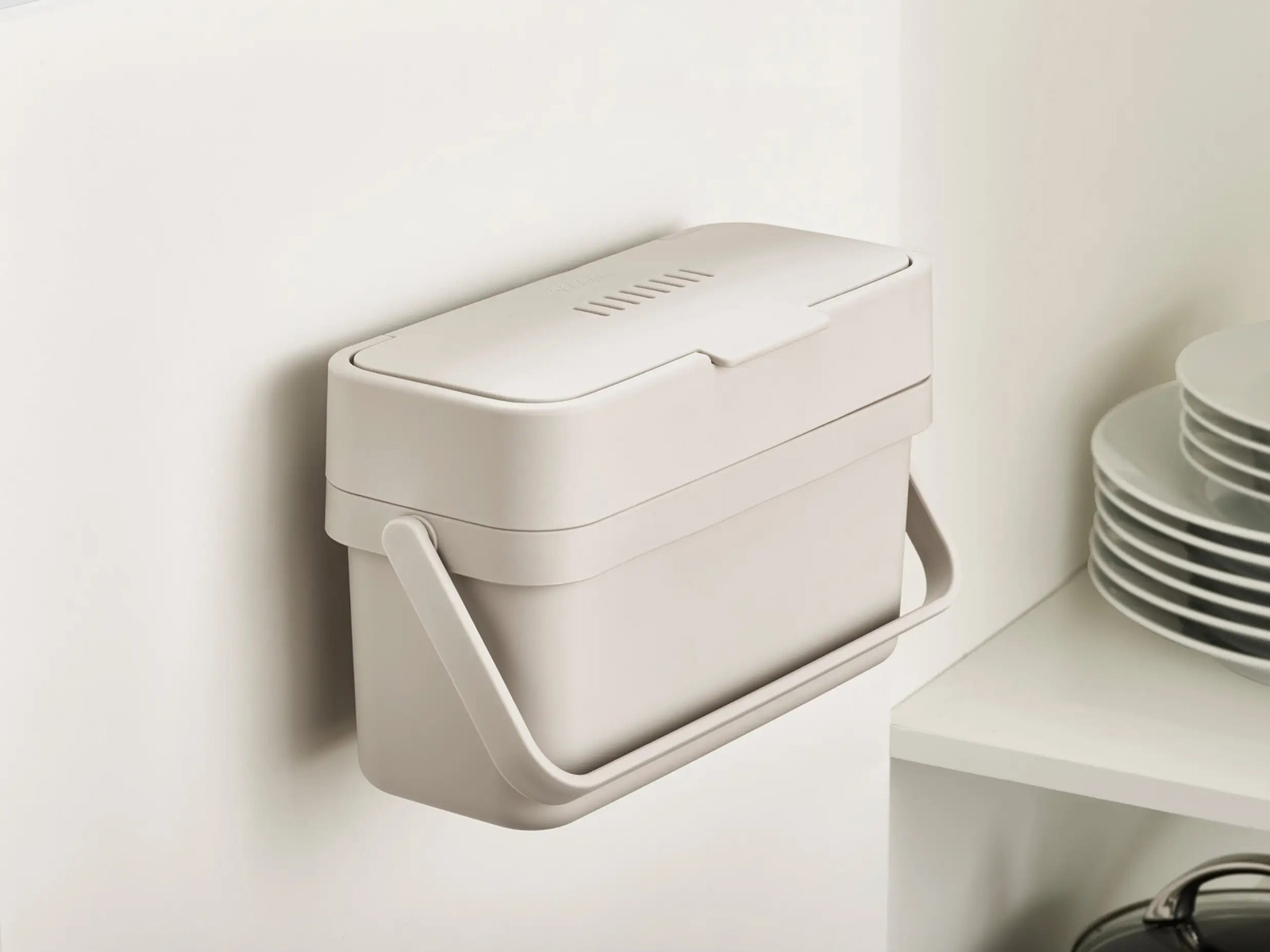 Pojemnik kosza w prostokątnym smukłym kształcie idealnym do przechowywanie go w wewnątrz szafki kuchennej - w zestawie znajduje się uchwyt do montażu na wewnętrznej stroni drzwi szafki umożliwiający zawieszania na nim kompostownika.