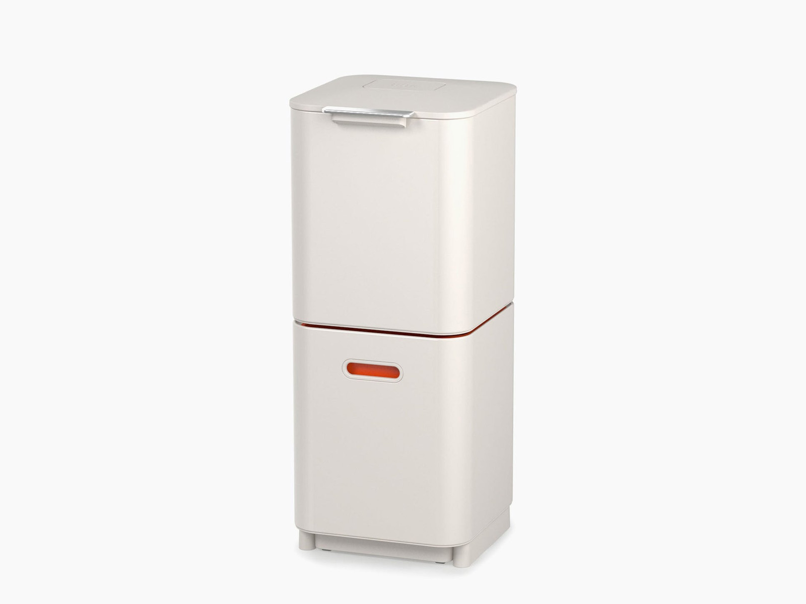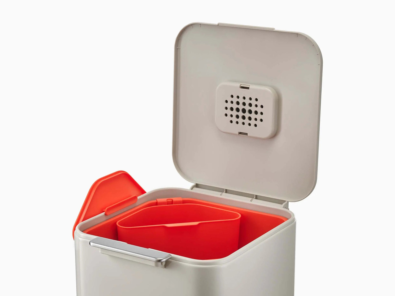 Wewnątrz górnej komory znajduje się narożny pojemnik na odpadki organiczne o pojemności 3 litry z pokrywką – kompostownik można wyjąć i postawiać na blacie, a pokrywkę zawiesić na krawędzi kosza.