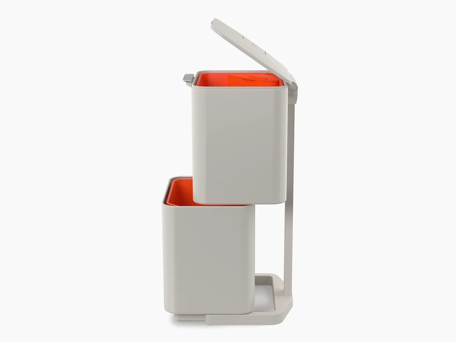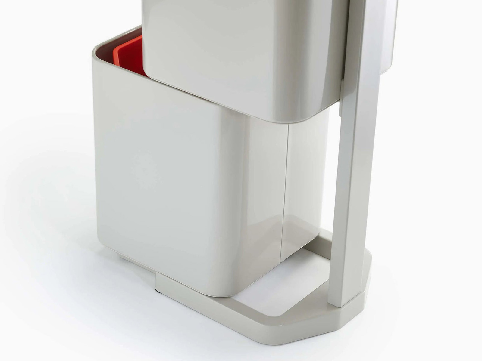Elegancki i praktyczny 2-poziomowy wąski kosz z dwoma komorami do segregacji śmieci oraz wyjmowanym kompostownikiem na odpadki organiczne.