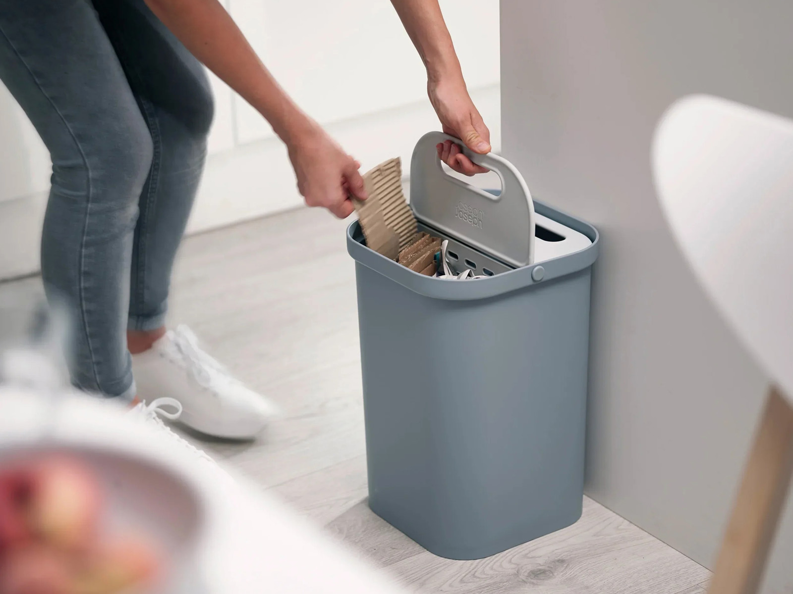 Dzięki temu sprytnemu kompaktowemu pojemnikowi łatwo jest wstępnie sortować, przechowywać i transportować surowce wtórne.