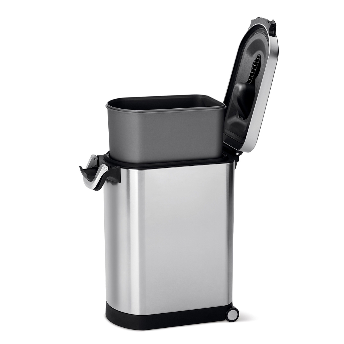 Kosz o wąskim kształcie wykonany z wytrzymałej stali nierdzewnej z niewidoczną powłoką FPP (fingerprint proof), na której nie pozostają smugi i odciski palców.