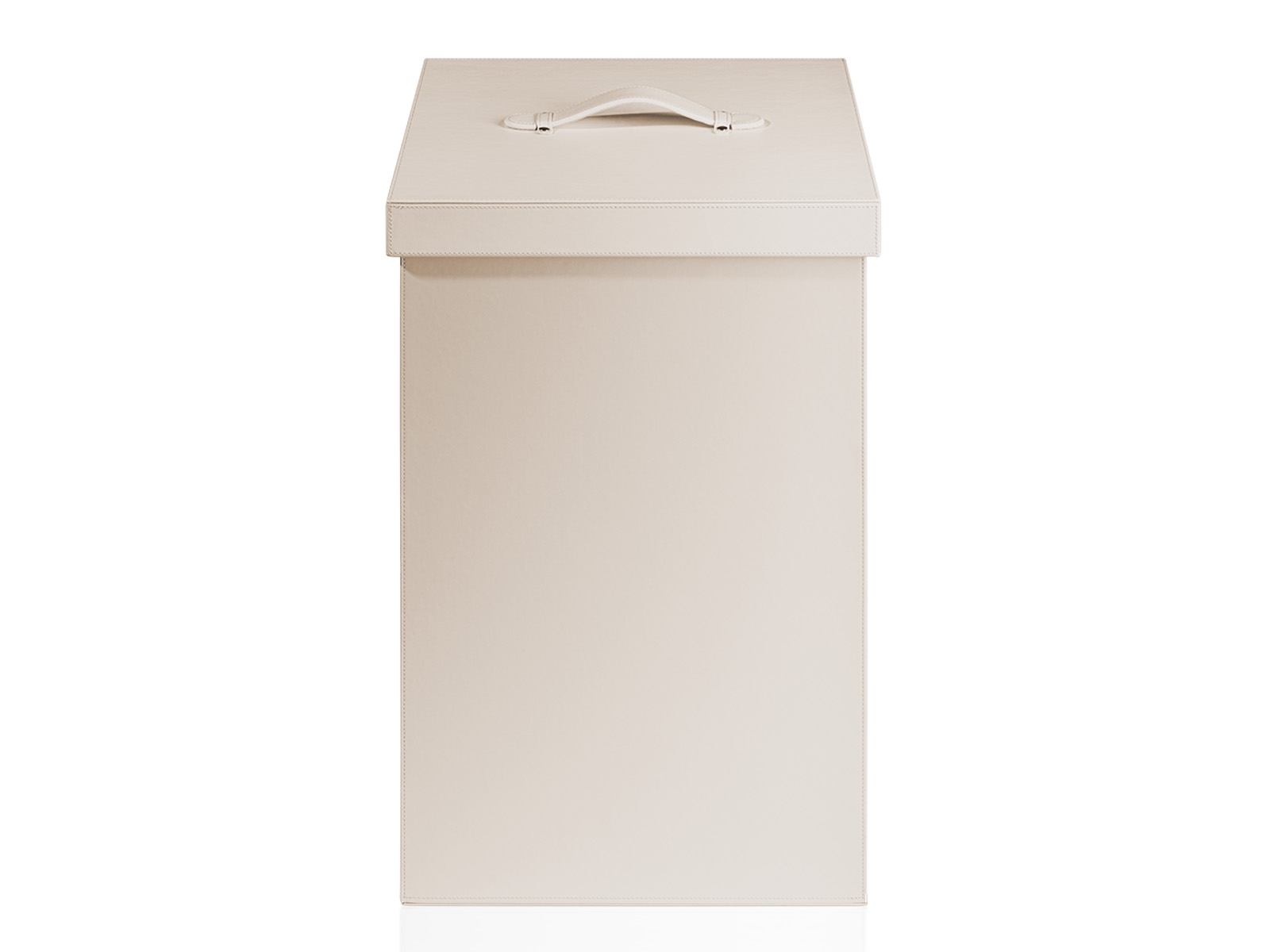 Elegancki łazienkowy zamykany kwadratowy kosz na bieliznę z dwoma bocznymi uchwytami do przenoszenia.