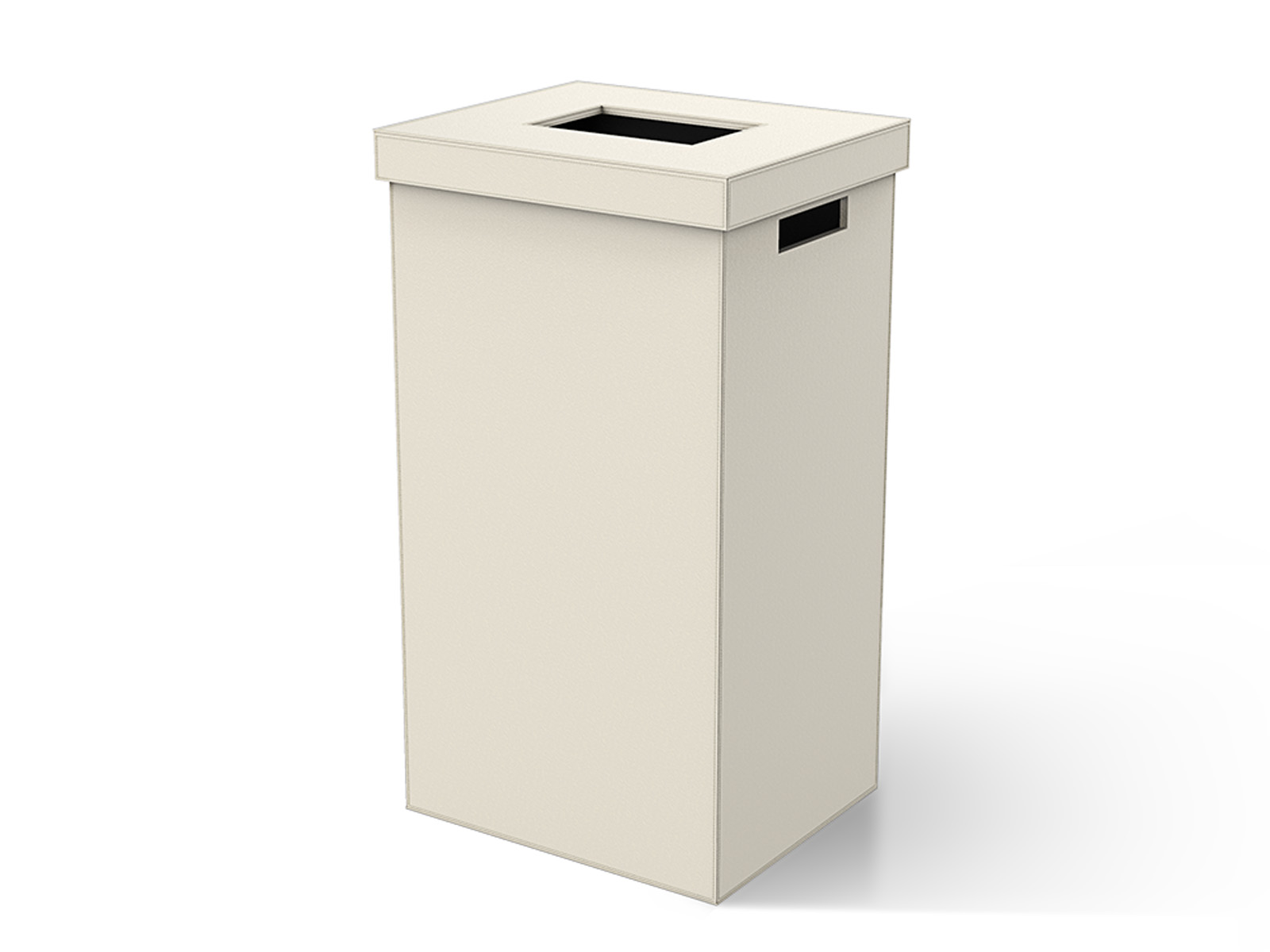 Uchwyty do przenoszenia w formie otworów na bocznych ściankach kosza, brzegi ścianek kosza ozdobione efektownym przeszyciem w kolorze skóry.