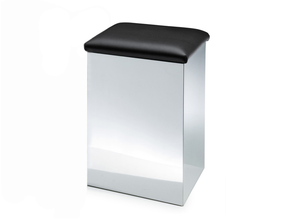 Pojemnik kosza kwadratowy wykonany z polerowanej błyszczącej stali nierdzewnej przykryty ozdobną miękką klapą/siedziskiem.