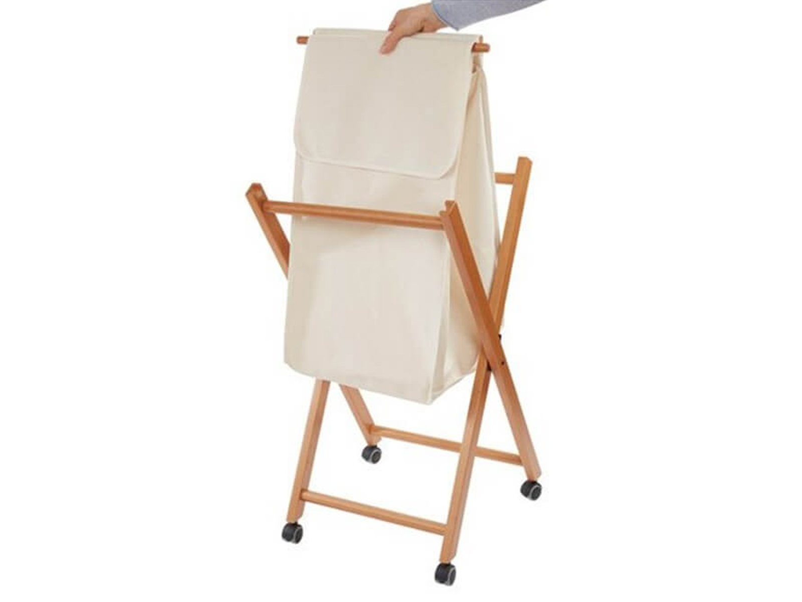 Praktyczny, składany kosz na pranie z kółkami, drewnianą ramą i bawełnianą torbą