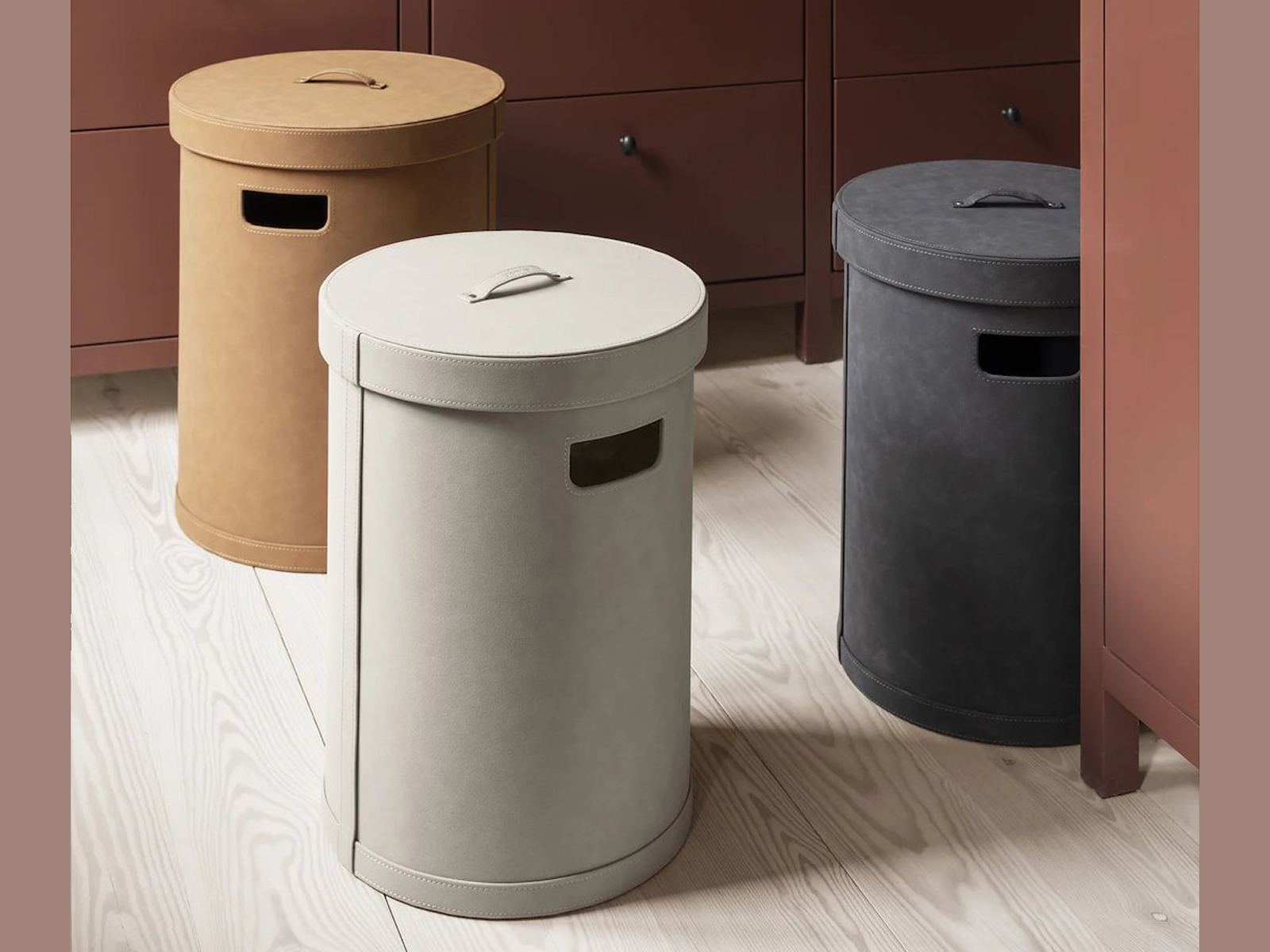 Seria koszy na pranie z kolekcji Sahla łączy prostą formę z estetycznym wykończeniem i funkcjonalnym zastosowaniem. Cylindryczny kształt oraz miękka, skórzana powierzchnia imitująca zamsz nadają całości zarówno elegancki, jak i uporządkowany charakter. Każdy kosz wyposażony jest w dopasowaną pokrywę z uchwytem, która chroni pranie i dyskretnie je ukrywa. Różne rozmiary i kolory pozwalają na idealne dopasowanie do stylu sypialni, łazienki lub garderoby.