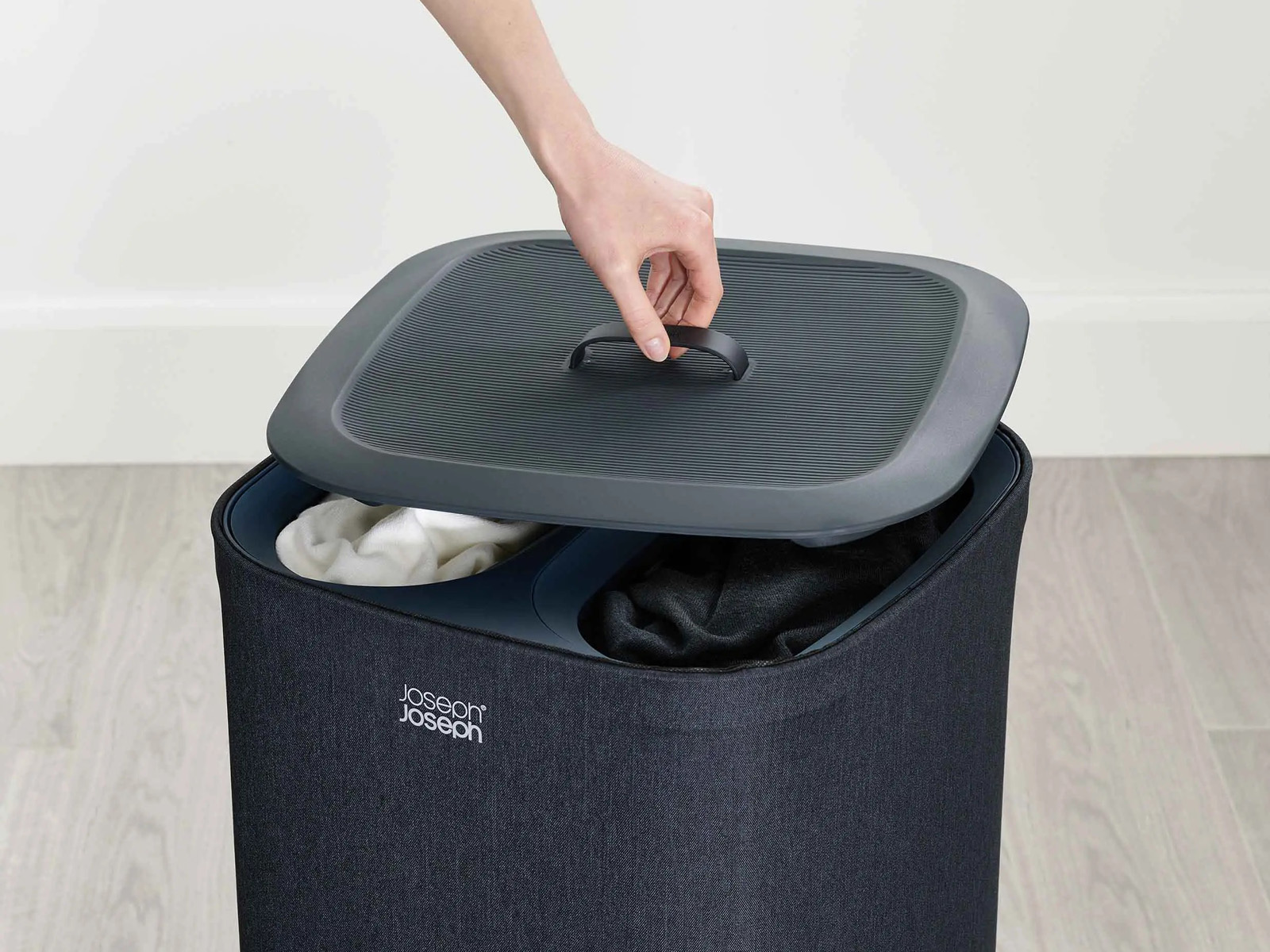 Elegancki i praktyczny dwukomorowy kosz do segregacji i przechowywania bielizny oraz ubrań przeznaczonych do prania.