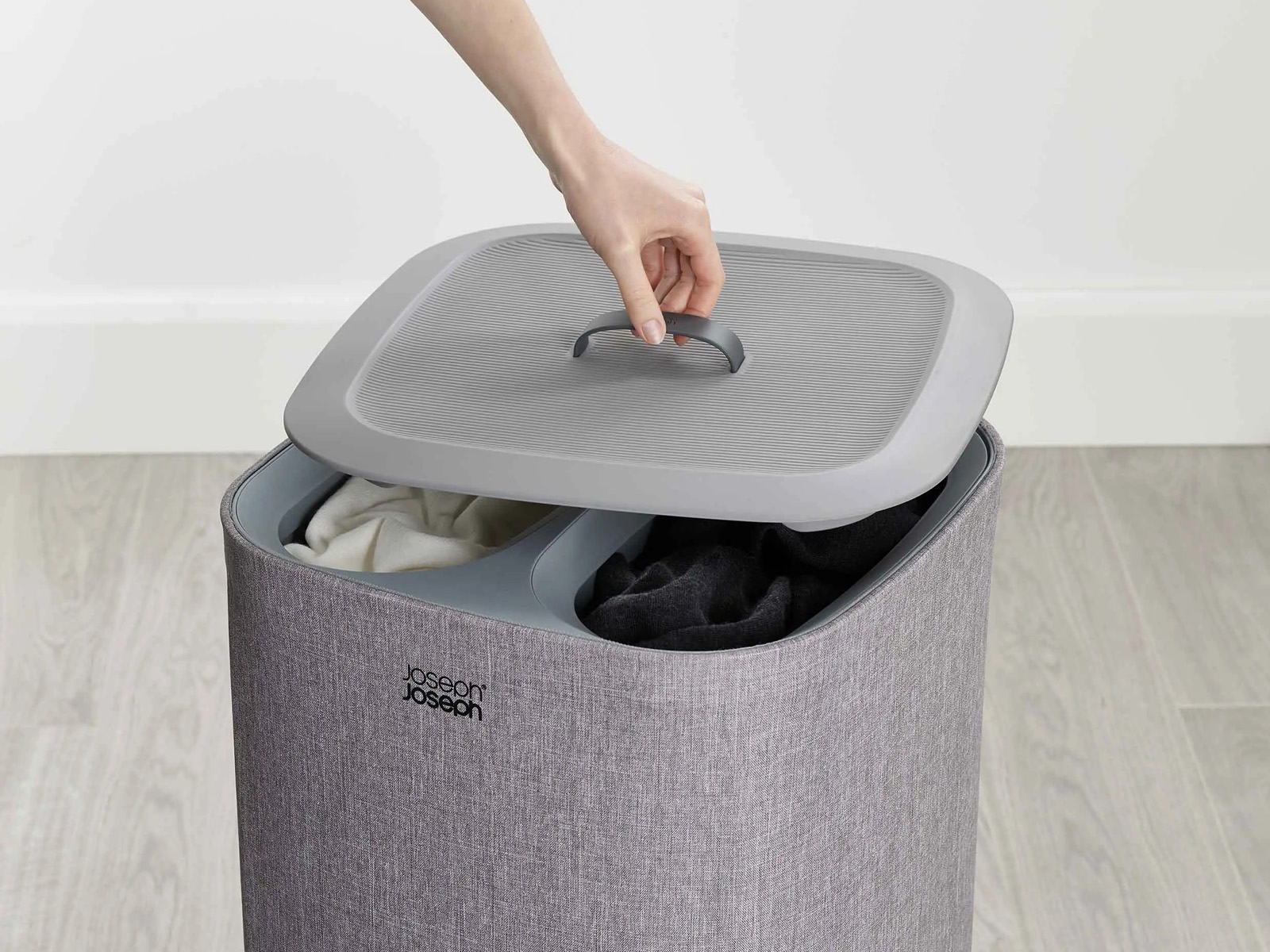 Elegancki i praktyczny dwukomorowy kosz do segregacji i przechowywania bielizny oraz ubrań przeznaczonych do prania.