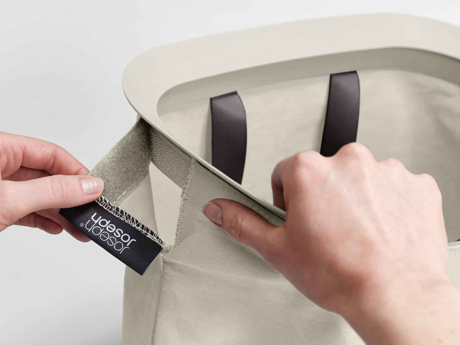 Komory kosza tworzą 3 wyjmowane bawełniane torby z wygodnymi uszami do łatwego przenoszenia oraz opróżniania ich z zawartości.