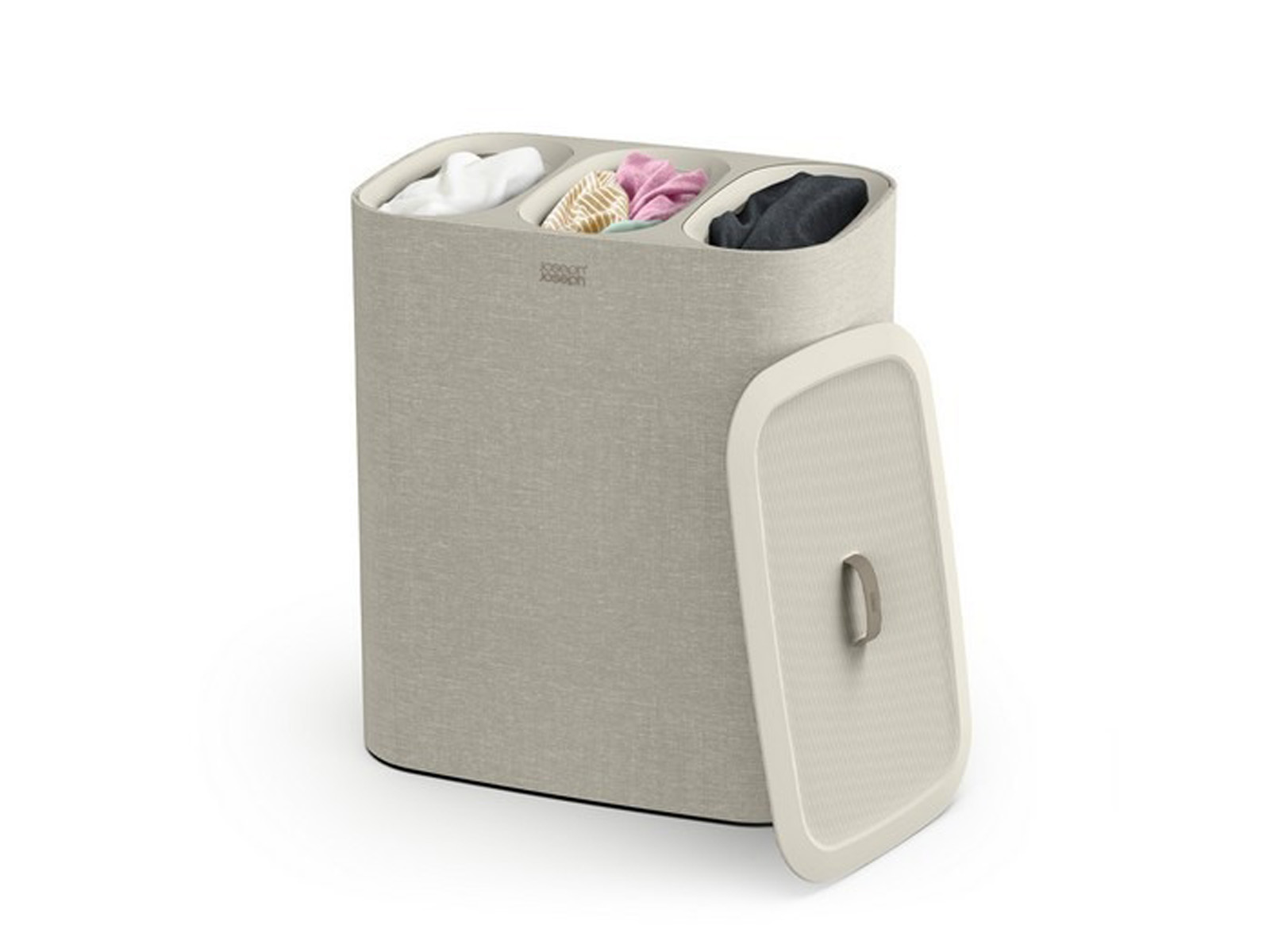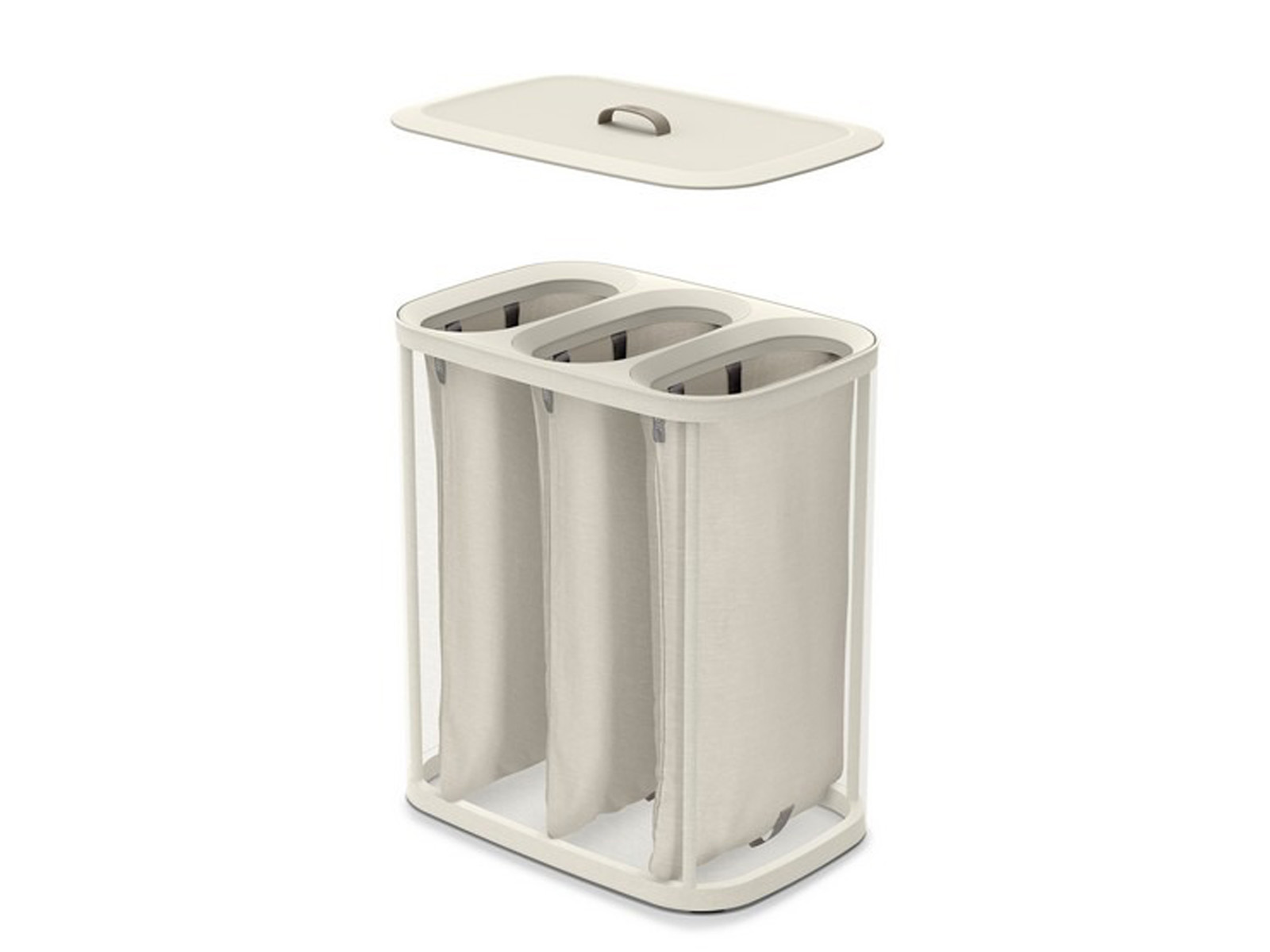 Elegancki i praktyczny trzykomorowy kosz do segregacji i przechowywania bielizny oraz ubrań przeznaczonych do prania.