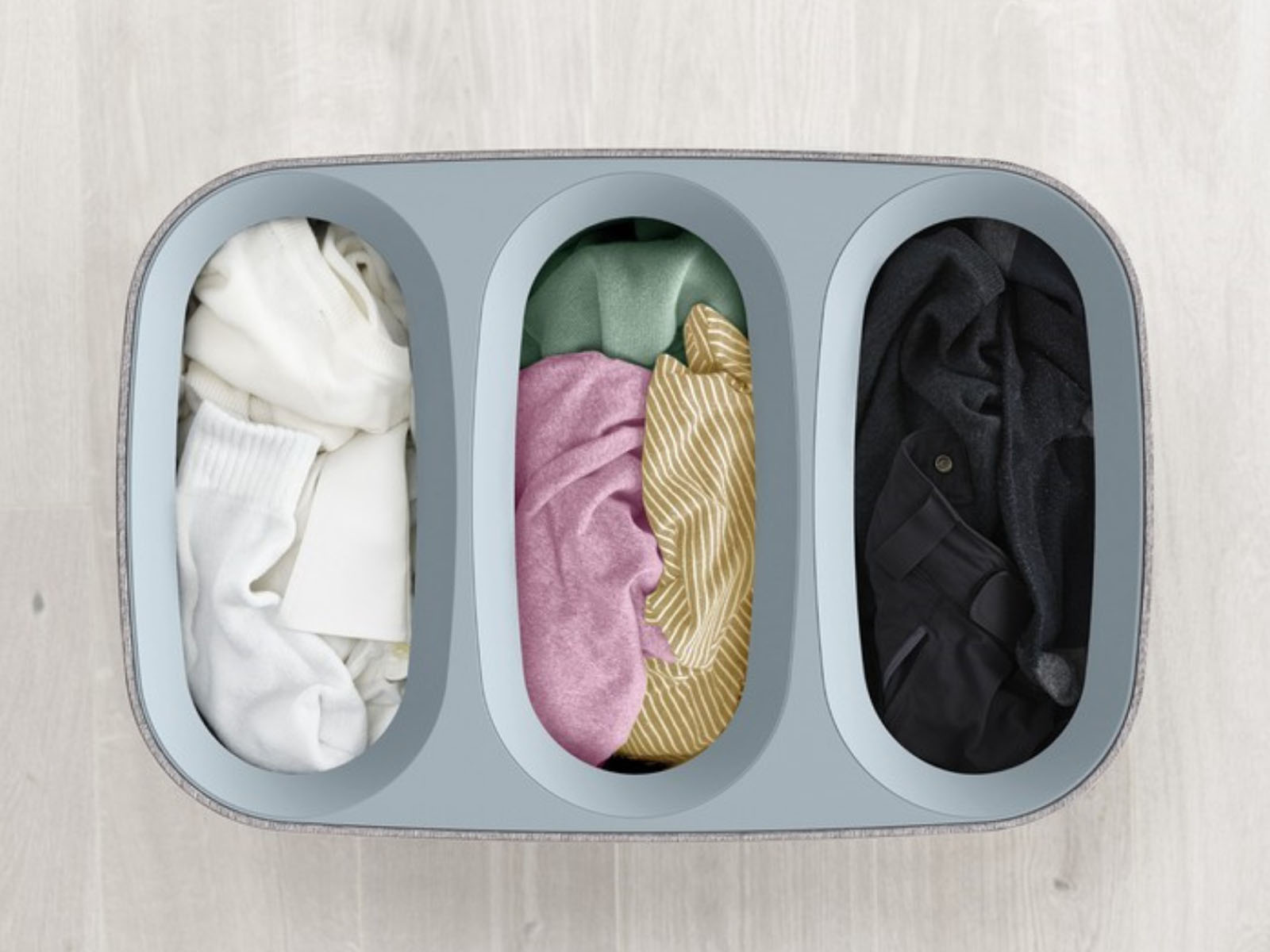 Kosz Joseph Joseph Tota pomaga utrzymać porządek wśród większych tekstyliów, jednocześnie pozostając stylowym elementem domowego wyposażenia.